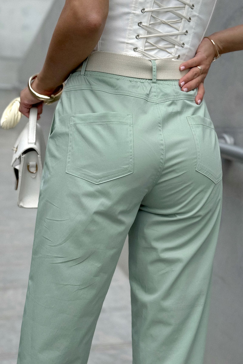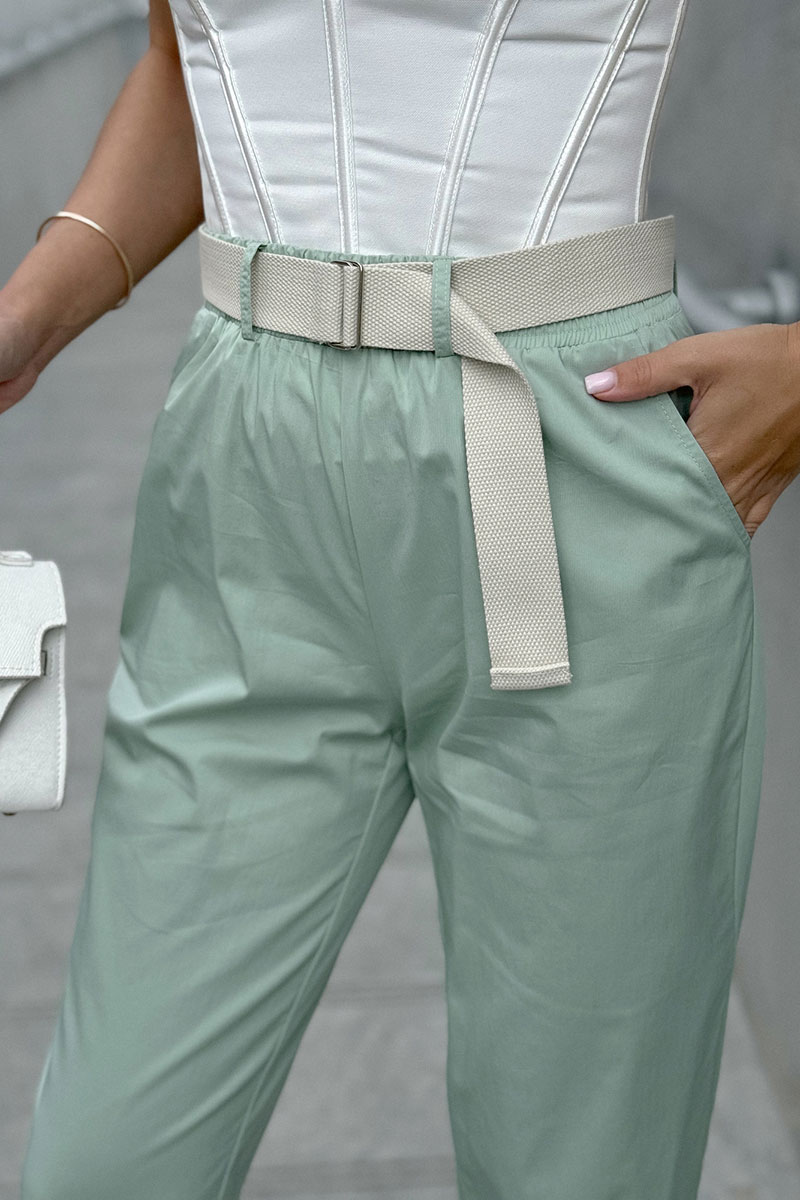 Брюки женские из текстильной ткани, слегка заужены к низу. В боковых швах расположены карманы. По низу передних половинок есть защип. Задняя половинка брюк с отрезной кокеткой и накладными карманами. Вверх брюк обработан поясом с резинкой (без молнии). ПОЯС ВХОДИТ В КОМПЛЕКТ.