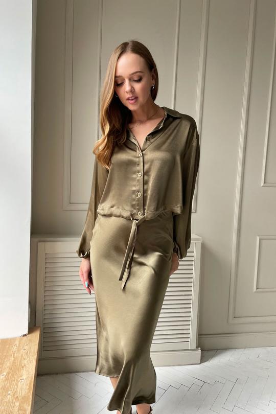 Блузка укороченная, снизу регулируется шнурком, застегивается на пуговицы спереди. Материал средней плотности, как атлас, гладкий, струящийся. Юбка застегивается на потайную молнию.