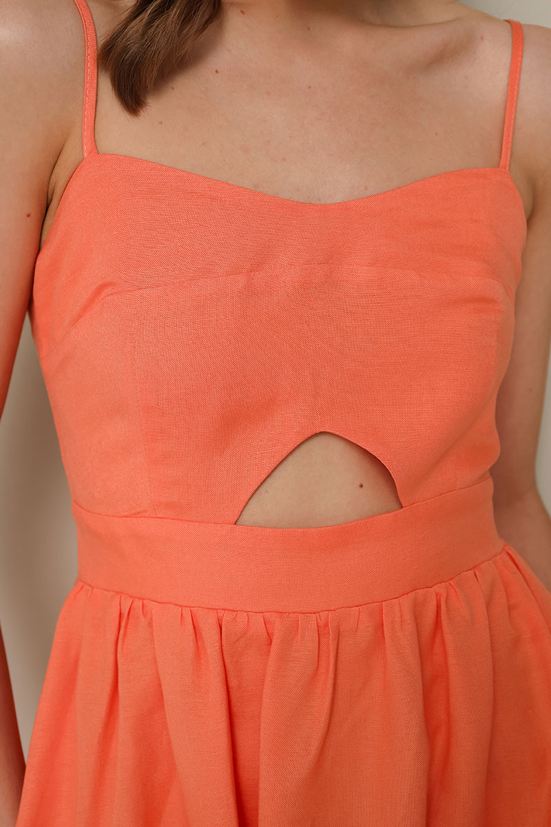 Платье отрезное по линии талии, на бретельках с регуляторами, выполнено из натурального льна. Лиф прилегающего силуэта, с фигурным вырезом в области линии талии. Застежка на потайную молнию в боковом шве. Спинка частично обработана венгеркой, для комфортной регуляции размера. Юбка А-образного силуэта, с внутренними карманами в боковых швах.