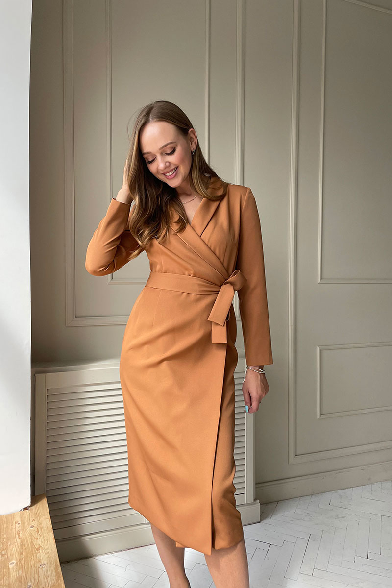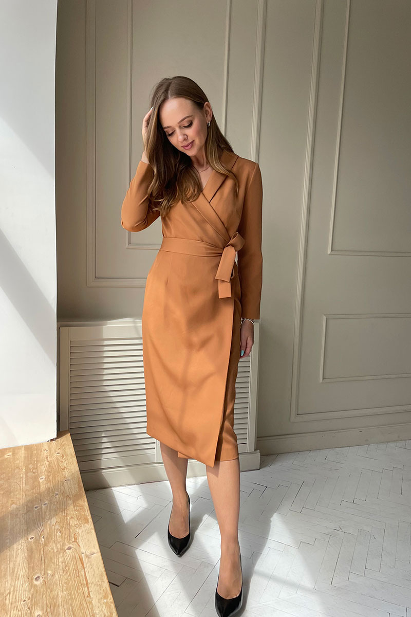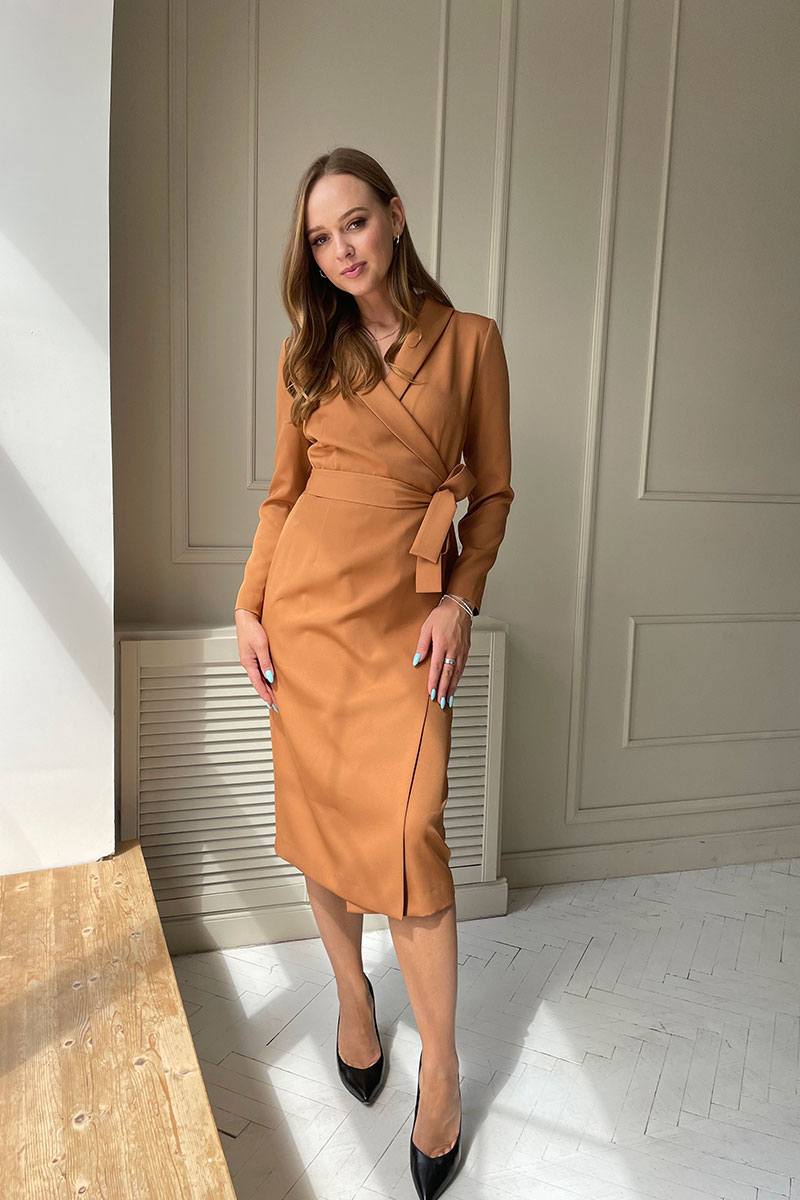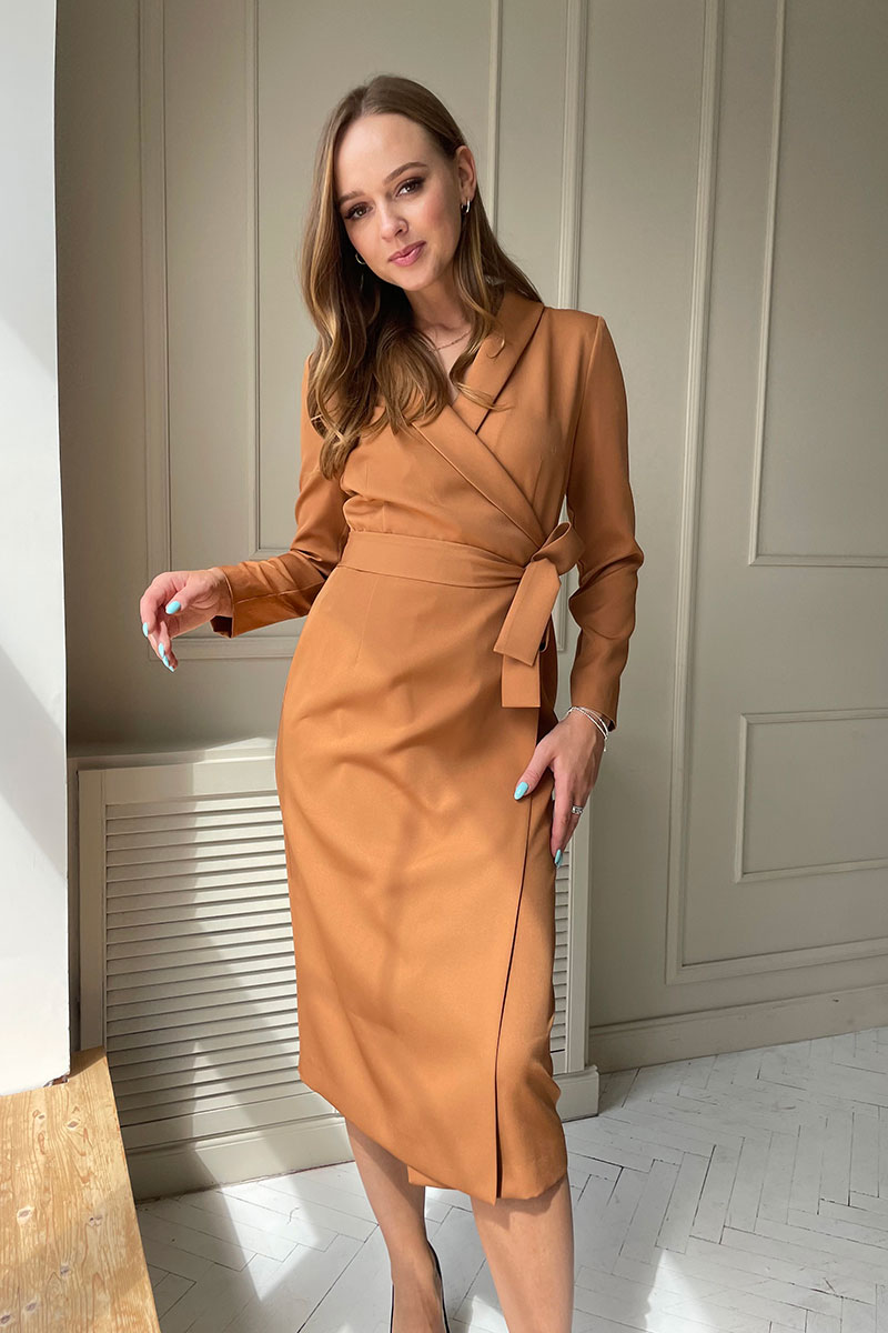 Платье-футляр полуприлегающего силуэта в длине миди, выполнено из костюмно-плательной ткани. Воротник шалевого типа. Застёжка на запах с потайной кнопкой. Рукава длинные втачные. По спинке средний шов. В комплекте прилагается пояс из основной ткани.
