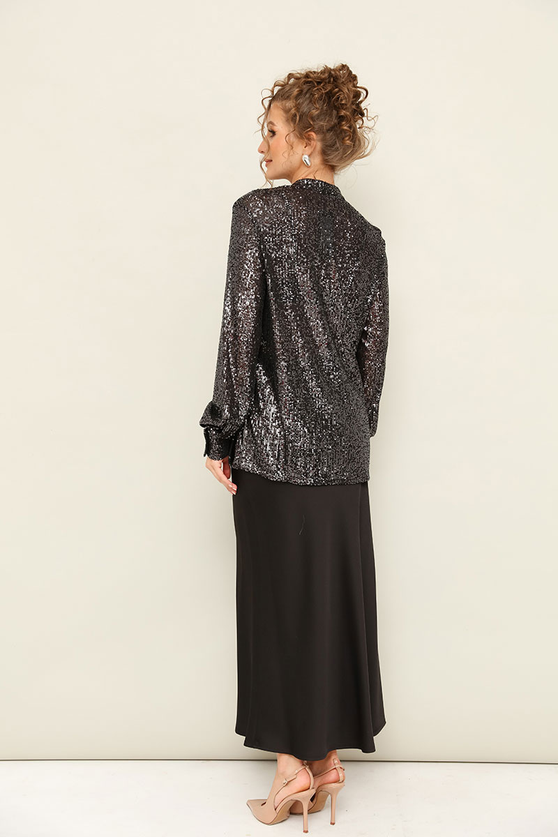 Блузка с пришитыми пайетками, прямого кроя, застегивается на пуговицы.