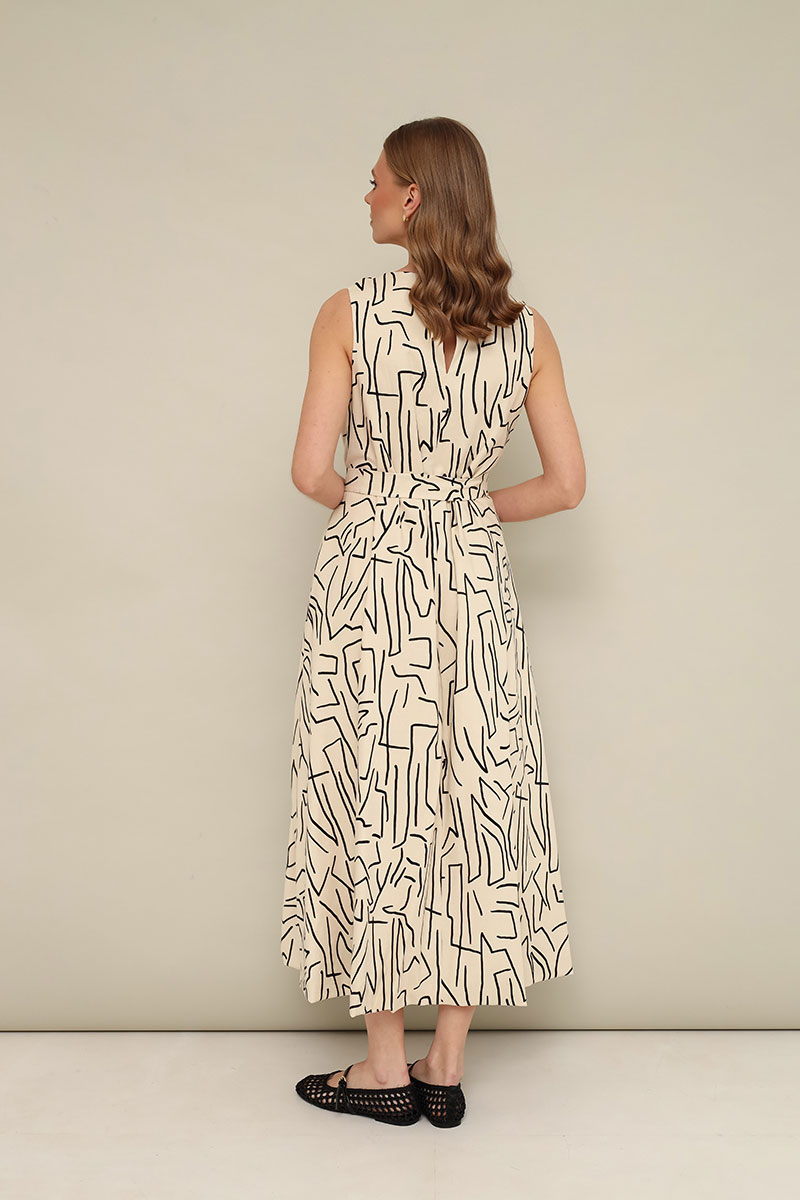 Эффектное платье-баллон, разведенное к низу в длине миди. Округлый вырез горловины. По спинке разрез с застежкой на пуговицу и навесную петлю. В боковых швах карманы. Платье на х/б подкладке. Пояс съемный из основной ткани.