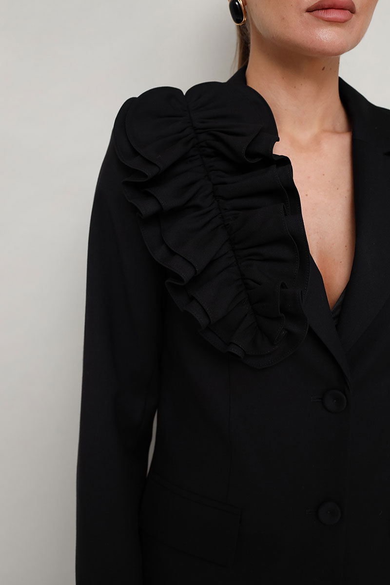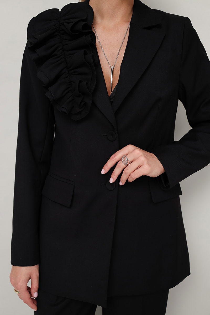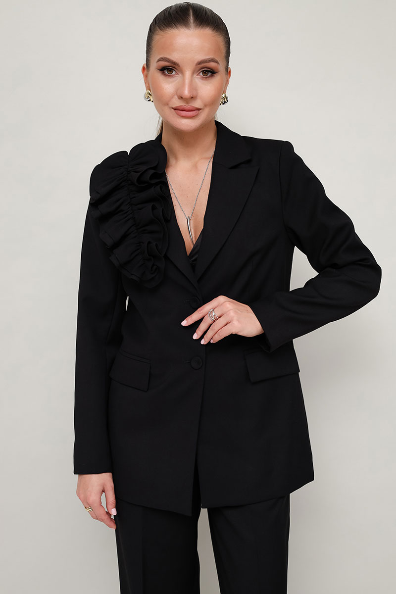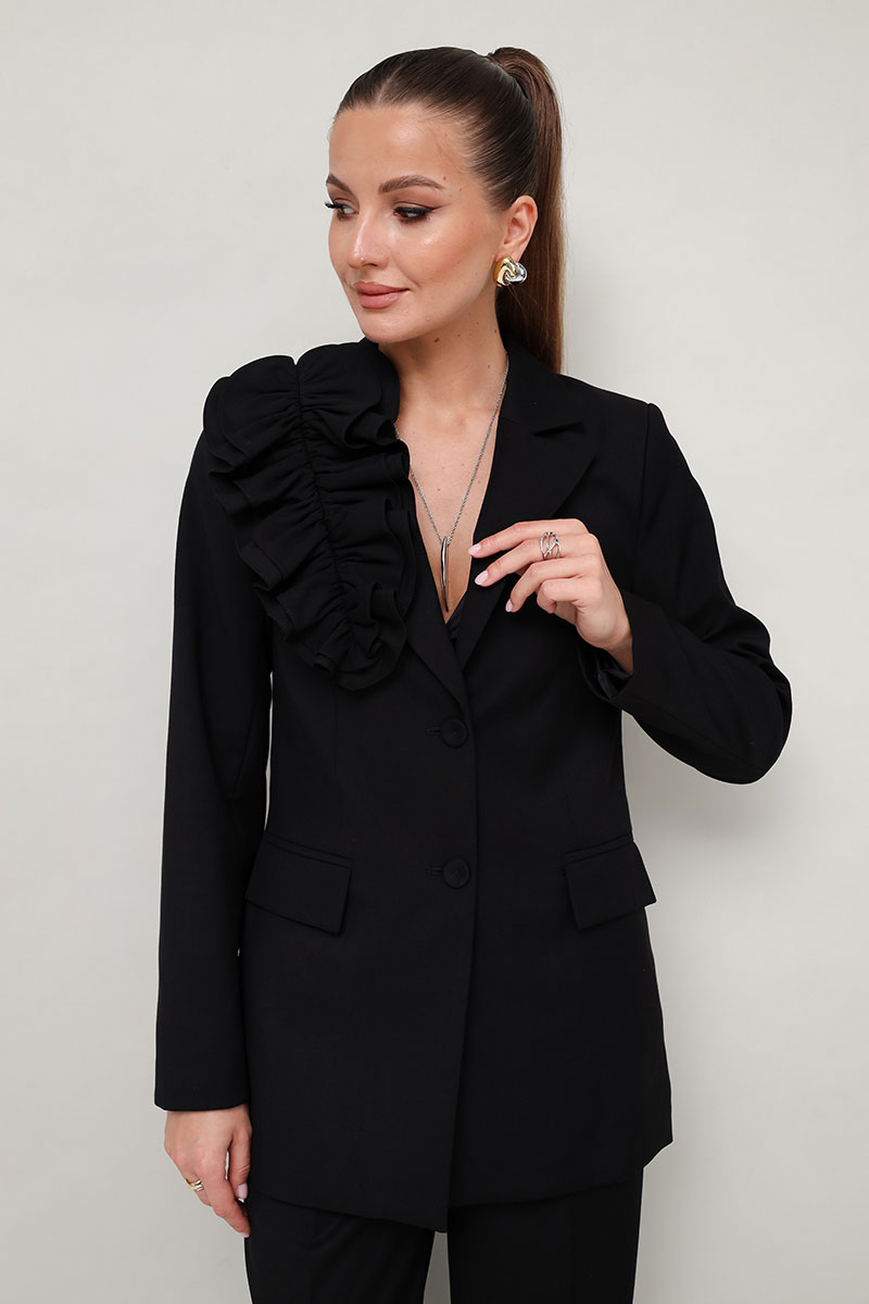 Жакет женский полуприлегающего силуэта с центральной застежкой на петли и обтяжные пуговицы.