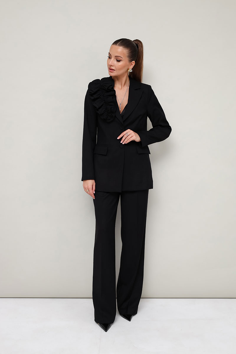 Эффектный 2-предметный комплект, состоящий из жакета и брюк, выполненный из костюмной ткани.