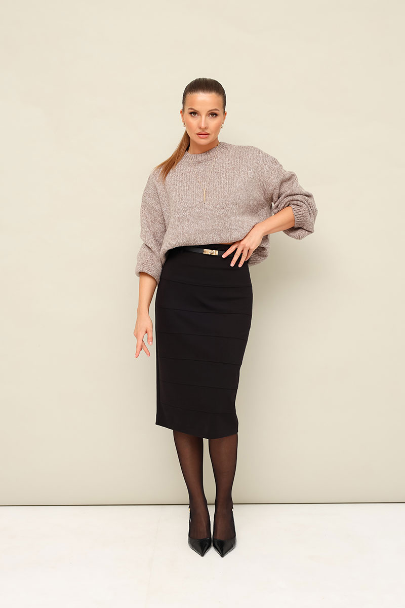 Юбка-карандаш с посадкой на талии и горизонтальными подрезами по переду. Обтачной пояс, застежка на потайную тесьму-молнию в среднем шве спинки. Для удобства движения сзади обработана шлица. В юбке предусмотрены шлевки. В комплекте прилагается акцентный ремень.