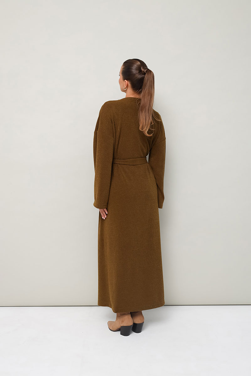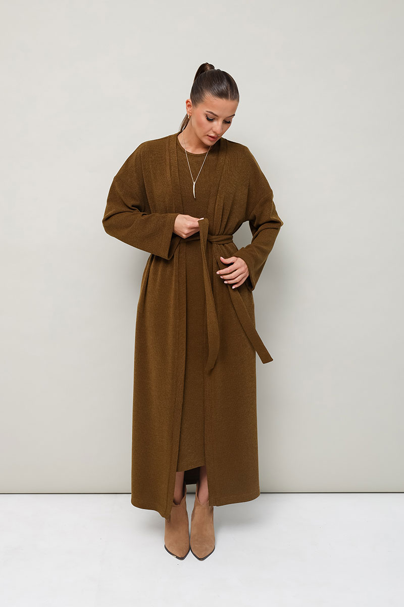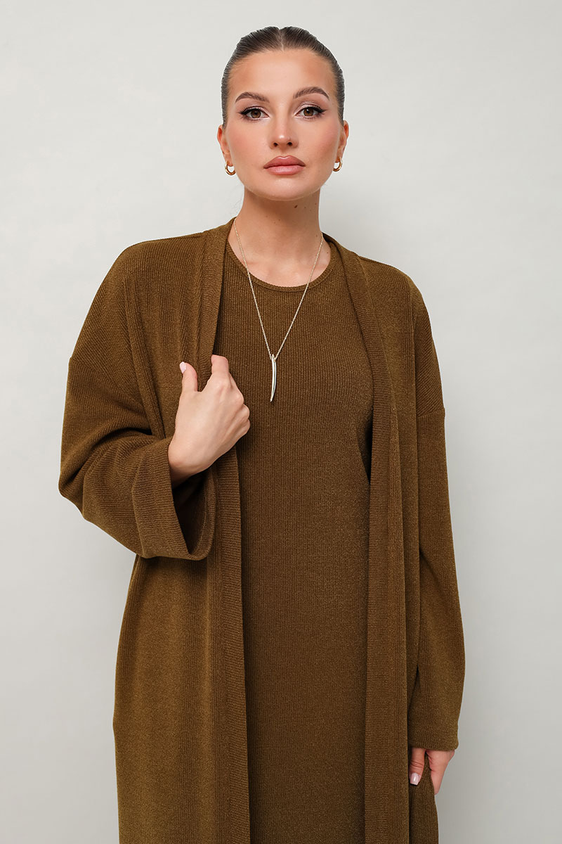 Женский комплект, состоящий из кардигана и платья, выполнен из мягкого уютного трикотажного полотна.
