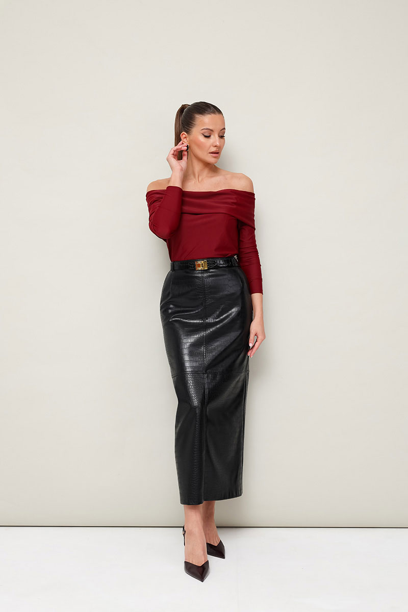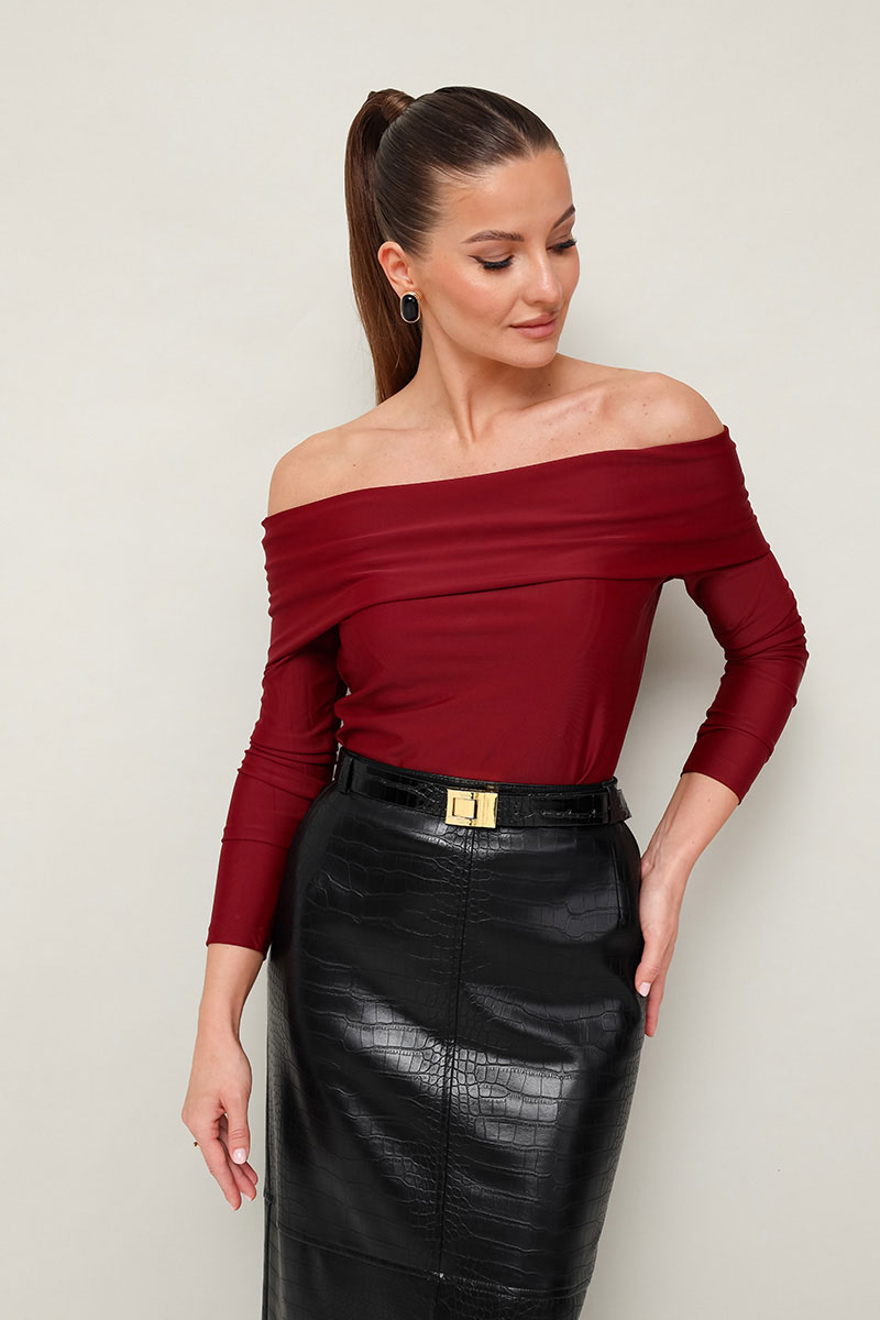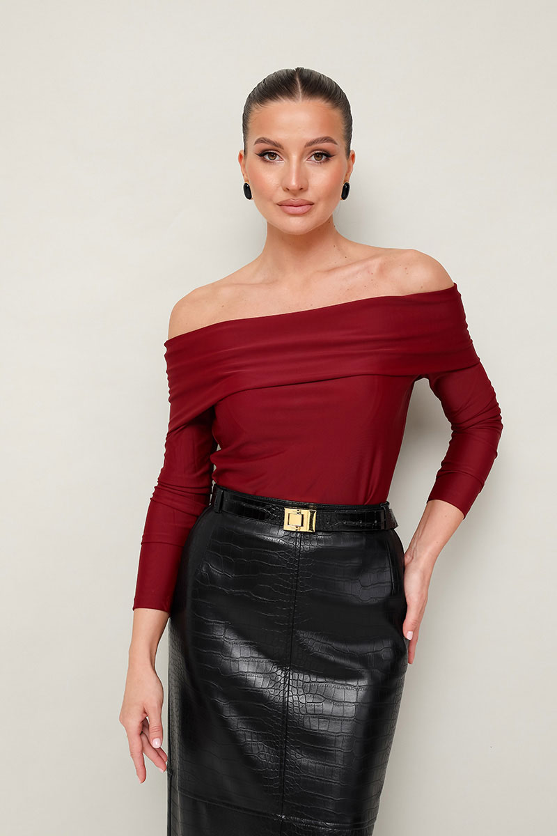 Блуза с открытыми плечами прилегающего силуэта, выполнен из эластичного полотна - бифлекс. По верхнему срезу обработан широкий отворот. Рукава втачные длинные.
