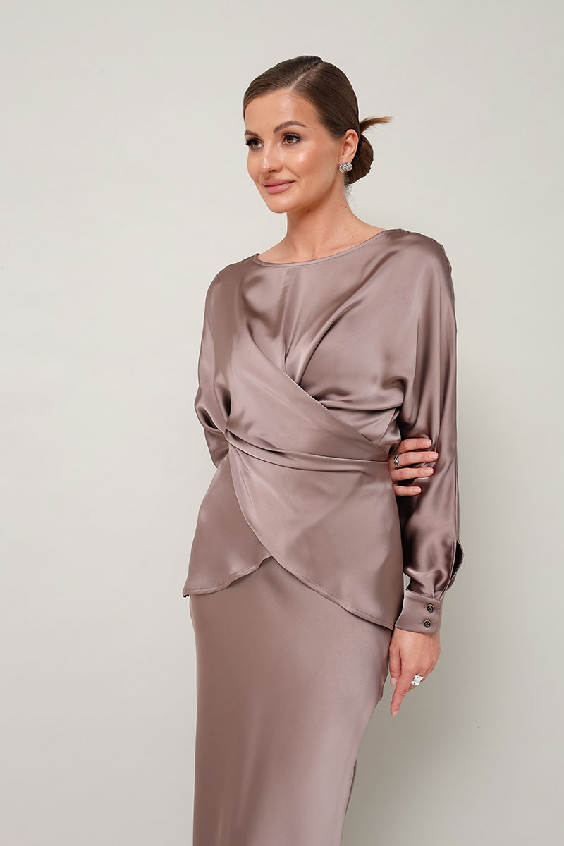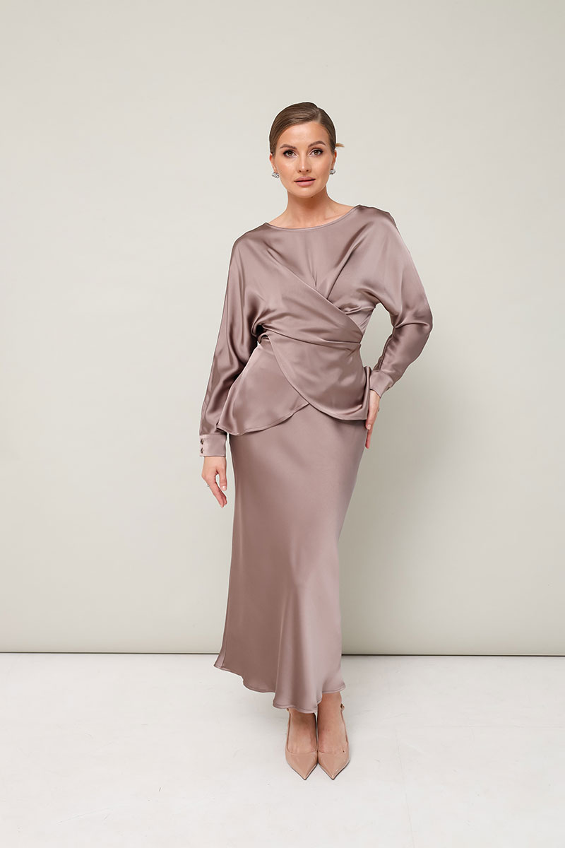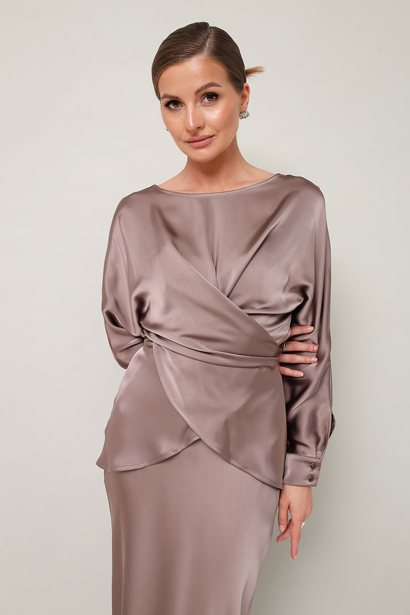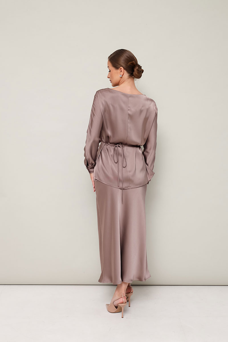 Элегантный 2-предметный комплект, состоящий из блузки и юбки, выполненный из струящейся ткани с деликатным блеском.