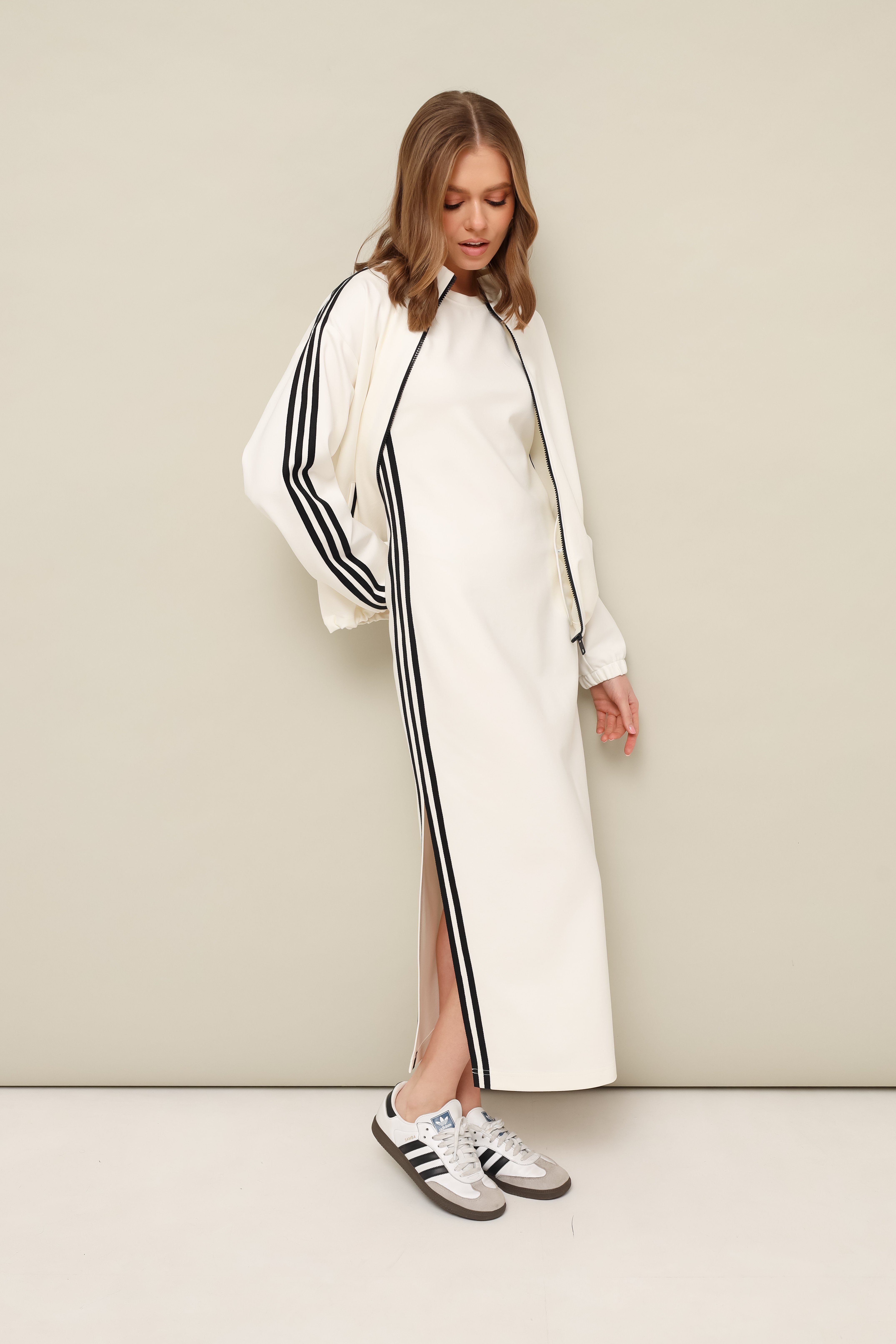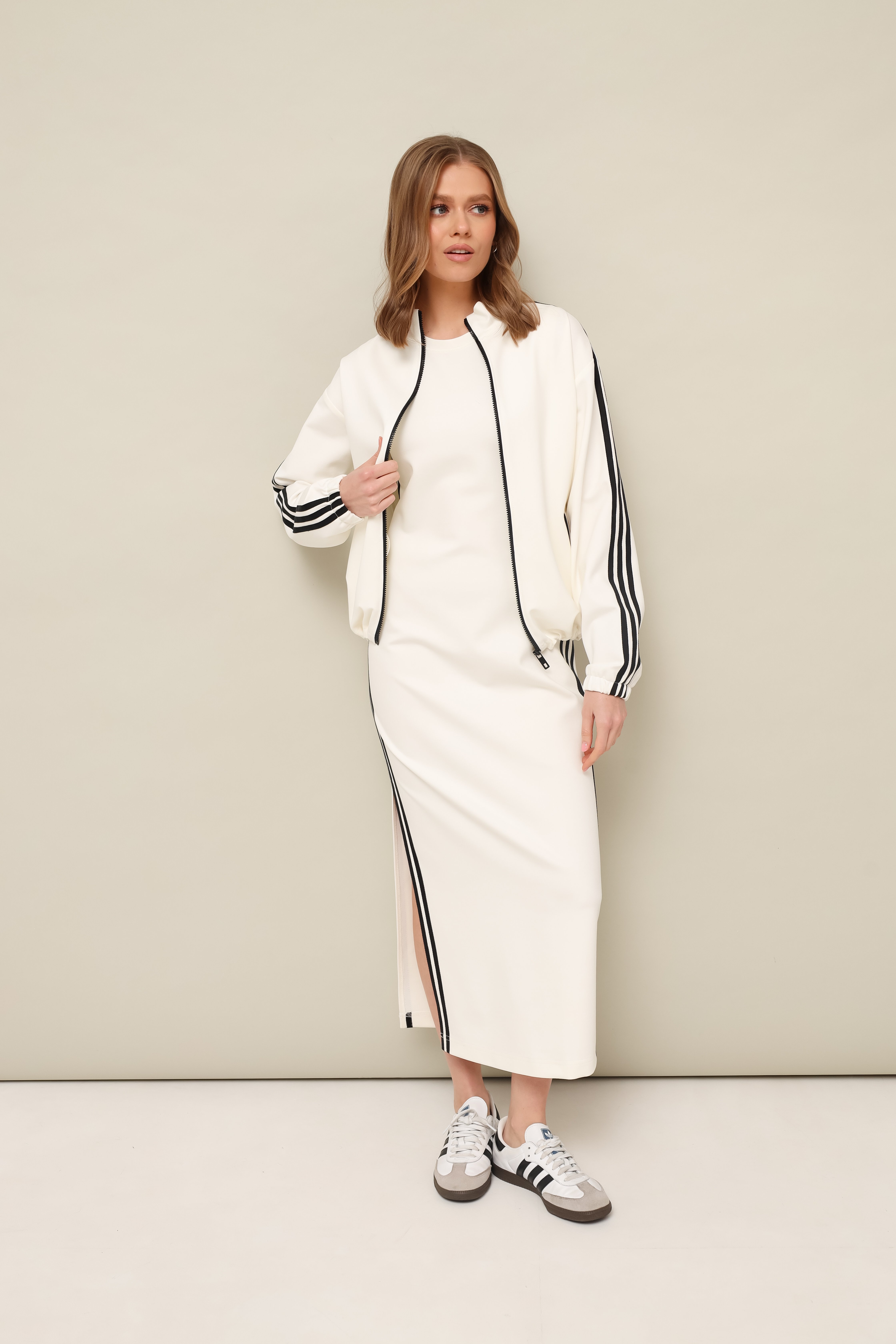 Платье полуприлегающего силуэта в длине миди. Округлый вырез горловины. В боковом шве обработан высокий разрез. По плечевому шву, рукавам, карманам бомбера и боковым швам платья настрочен декоративный элемент в виде хлопковой тесьмы контрастного цвета.
