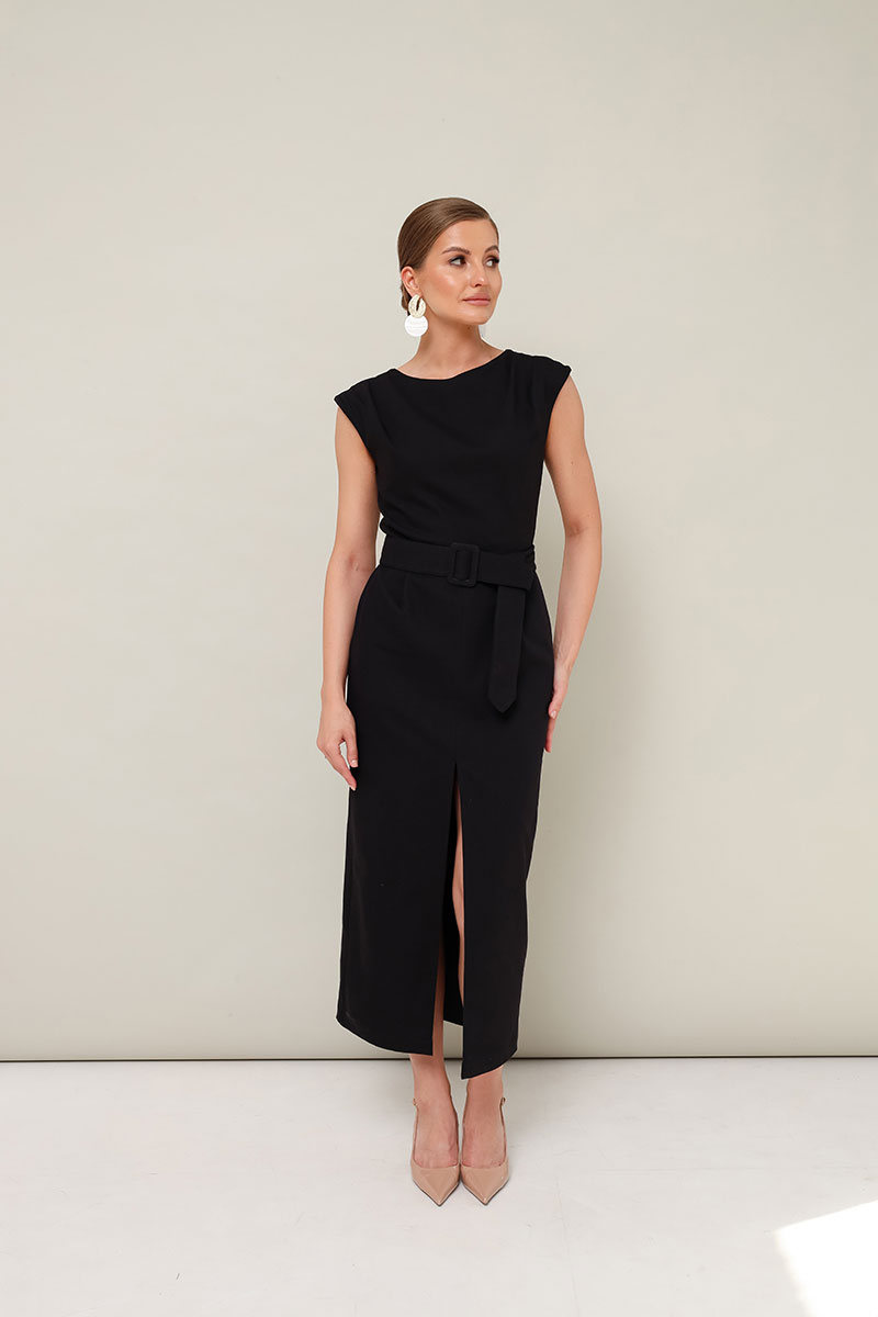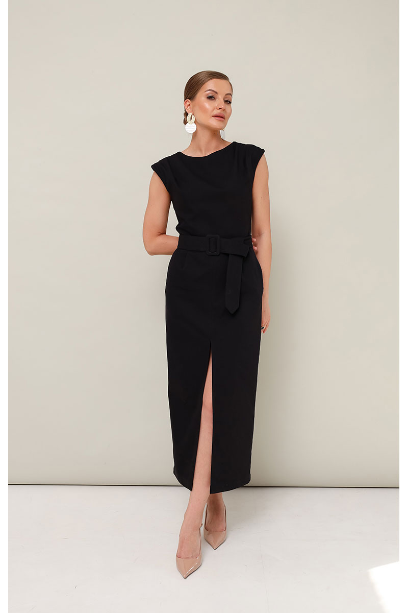 Стильное платье в длине миди, отрезное по линии талии, выполнено из джинсовой ткани. Вырез горловины - лодочка. По плечевым швам лифа и по талии обработаны защипы. Юбка со средним швом, переходящим в разрез. Спинка в V-образным вырезом. В среднем шве застёжка на потайную тесьму молнию. В комплекте прилагается пояс из основной ткани с обтяжной пряжкой.