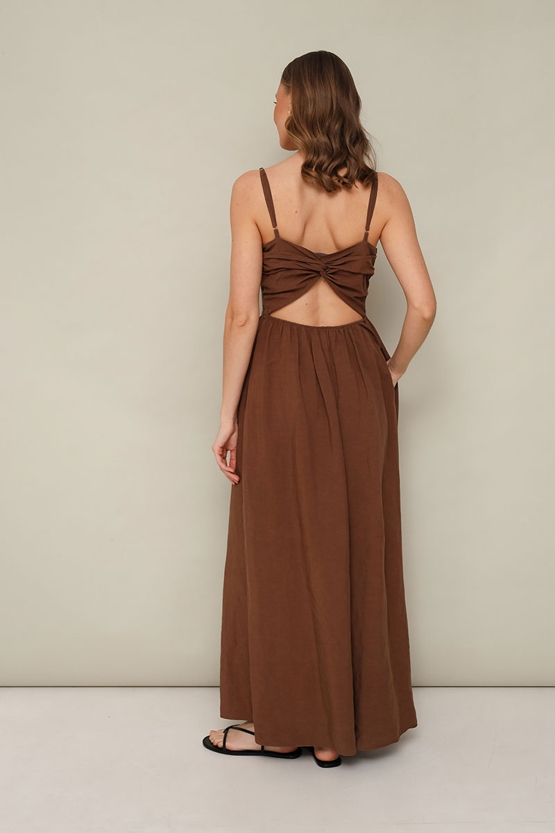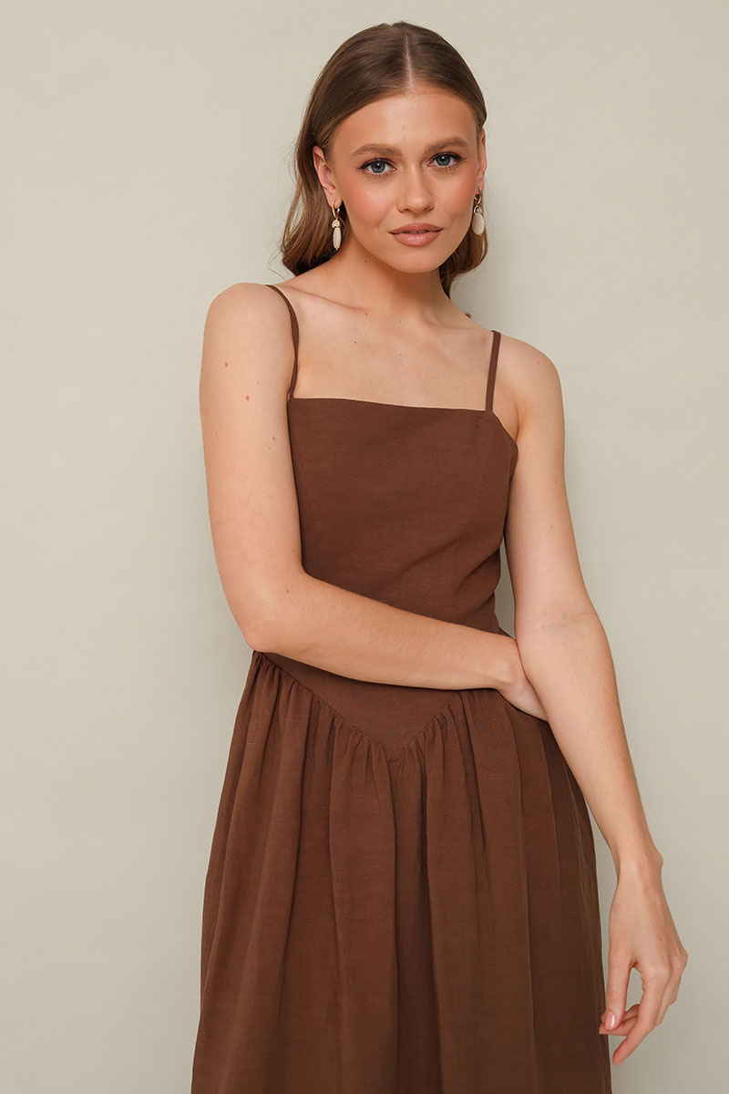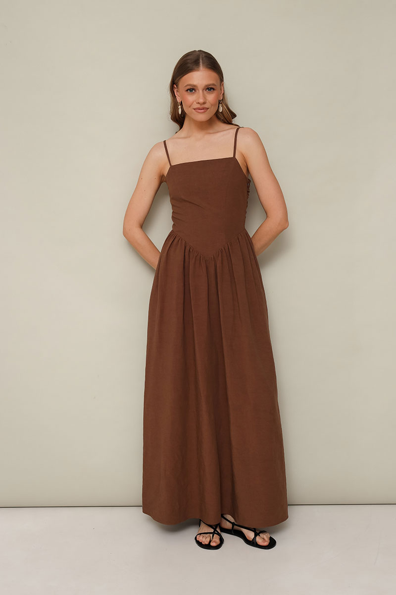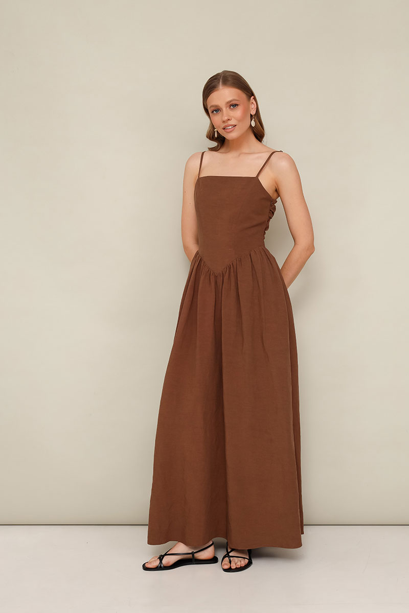 Платье в длине макси, с фигурным подрезом в области талии, выполнено из качественной натуральной ткани. Лиф прилегающий, на бретельках с регуляторами. Юбка А-силуэта, в боковых швах - карманы. На спинке обработан декоративный узел, вырез по линии талии на резинке. Застёжка в боковом шве на потайную молнию.