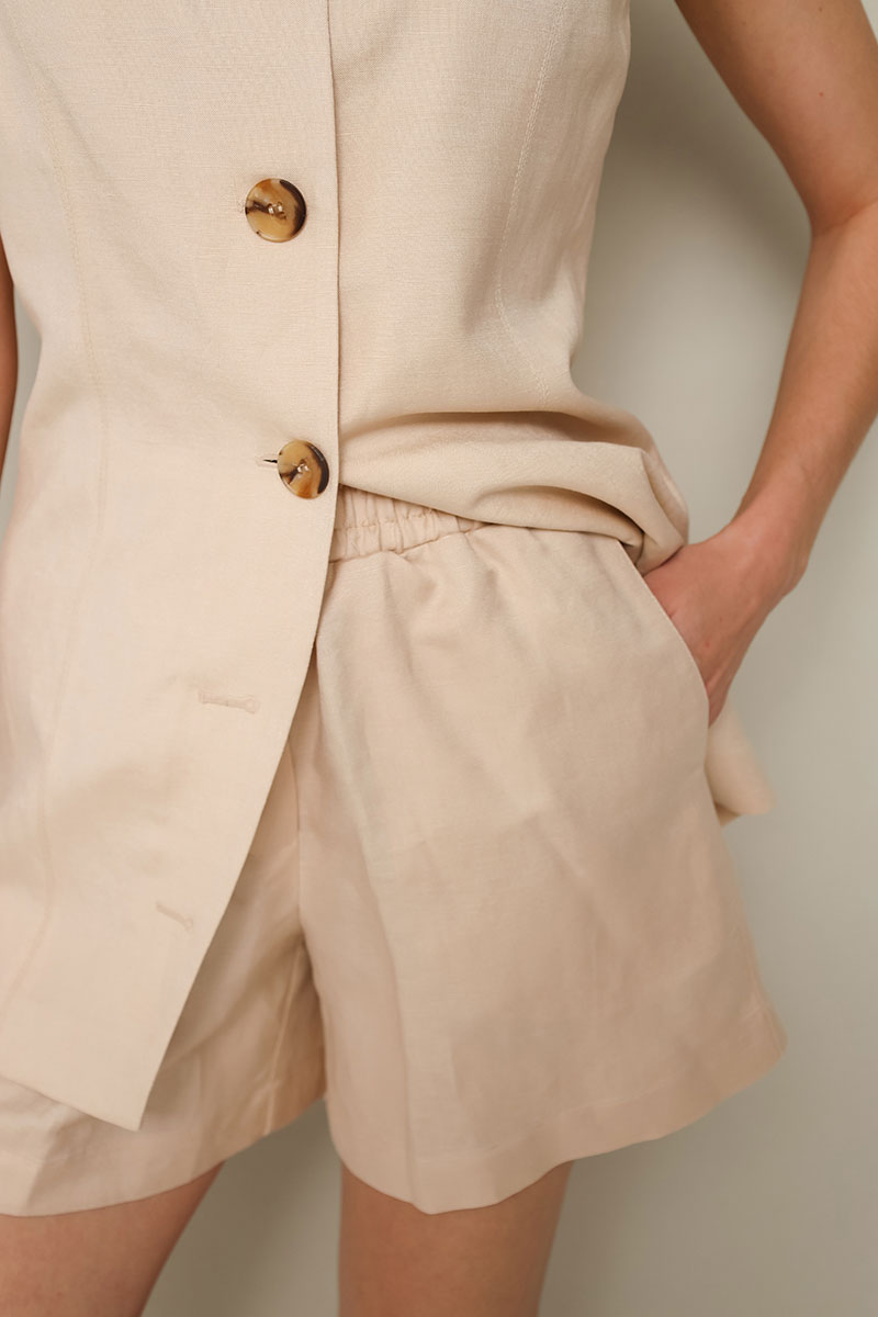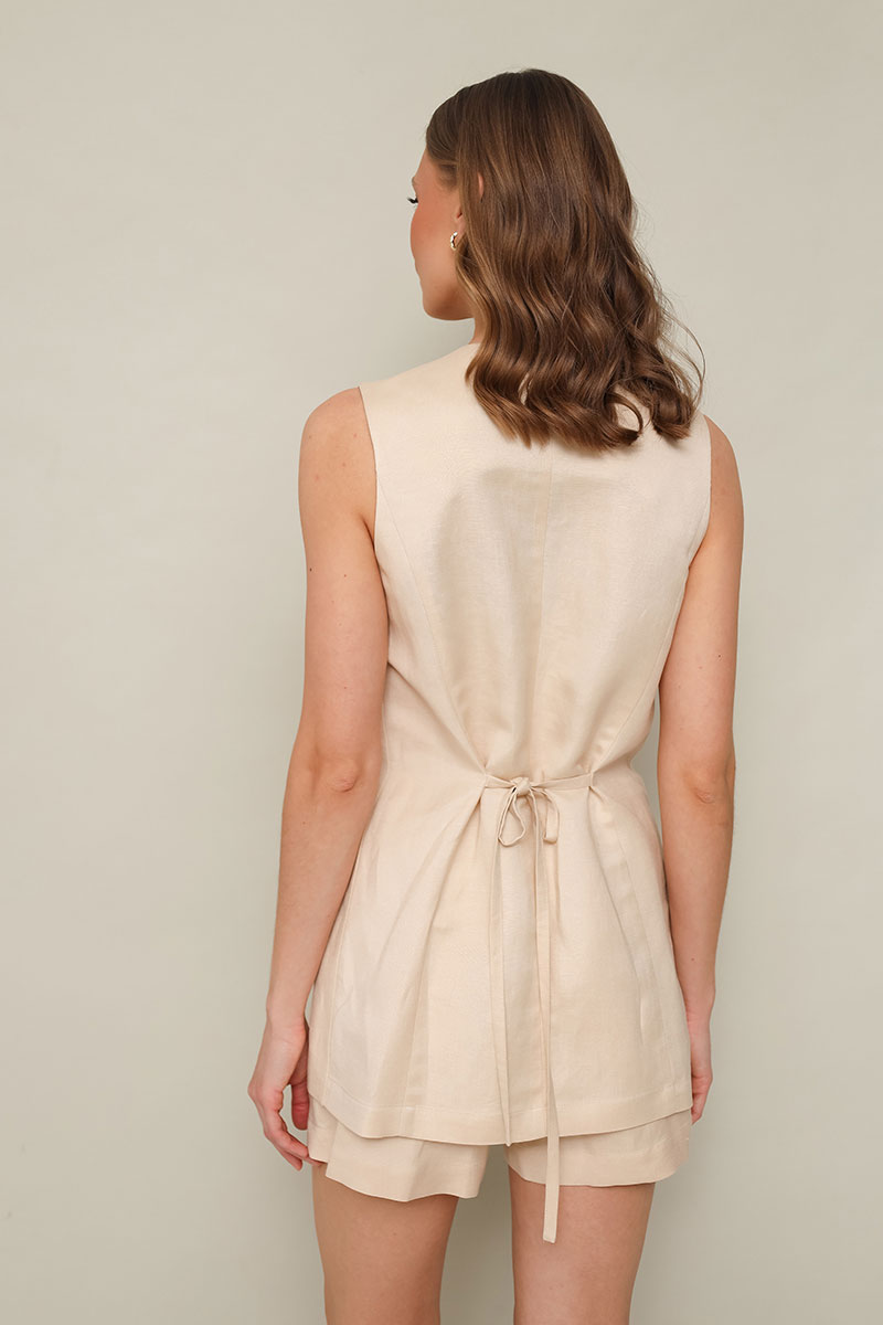 Стильный 2-предметный костюм, состоящий из жилета и шорт, выполнен из натурального льна.