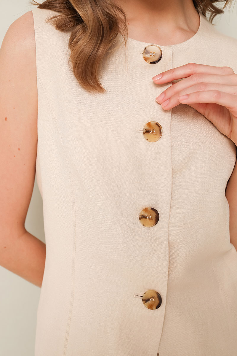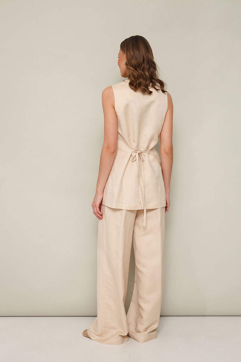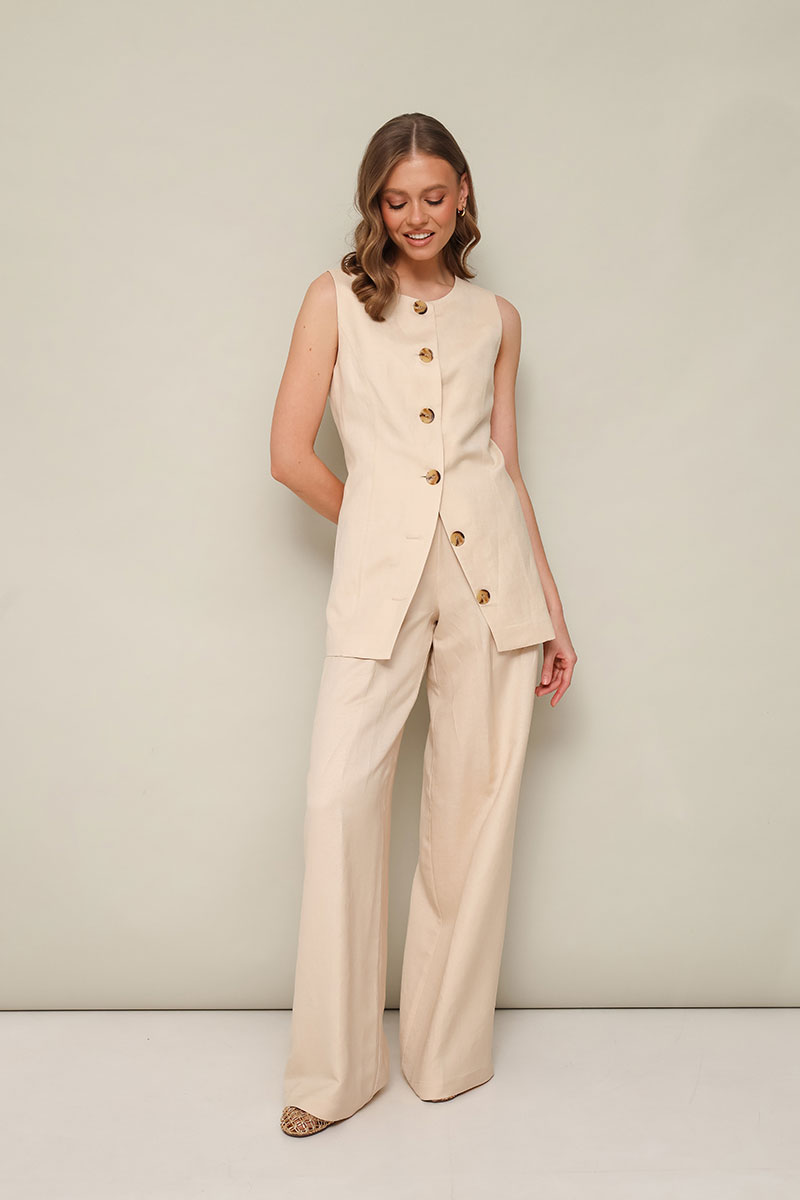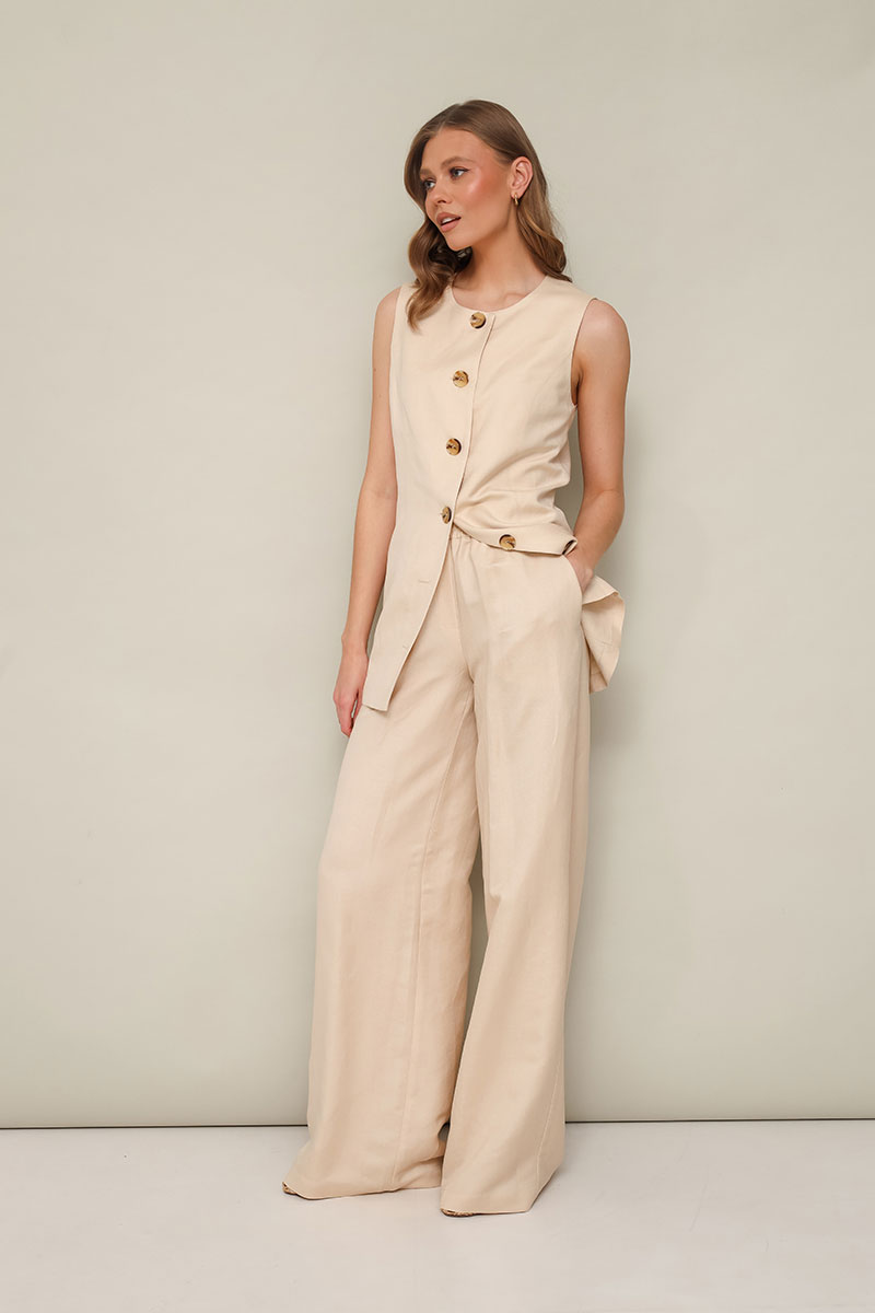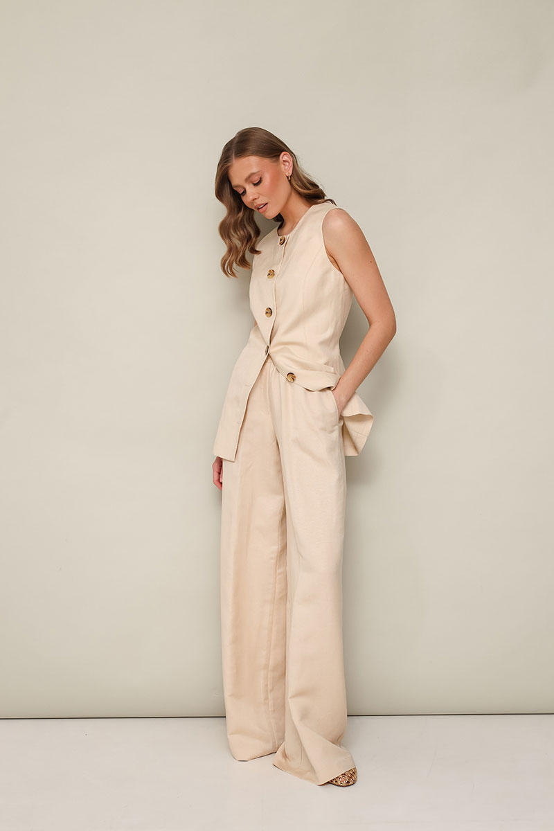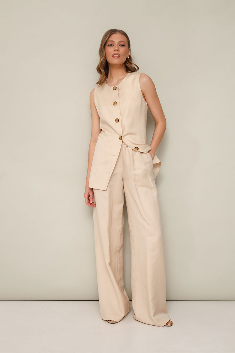 Стильный 2-предметный костюм, состоящий из жилета и брюк, выполнен из натурального льна.