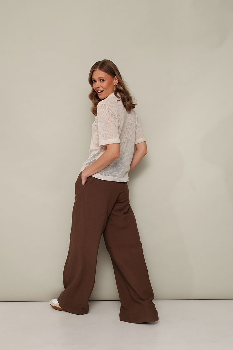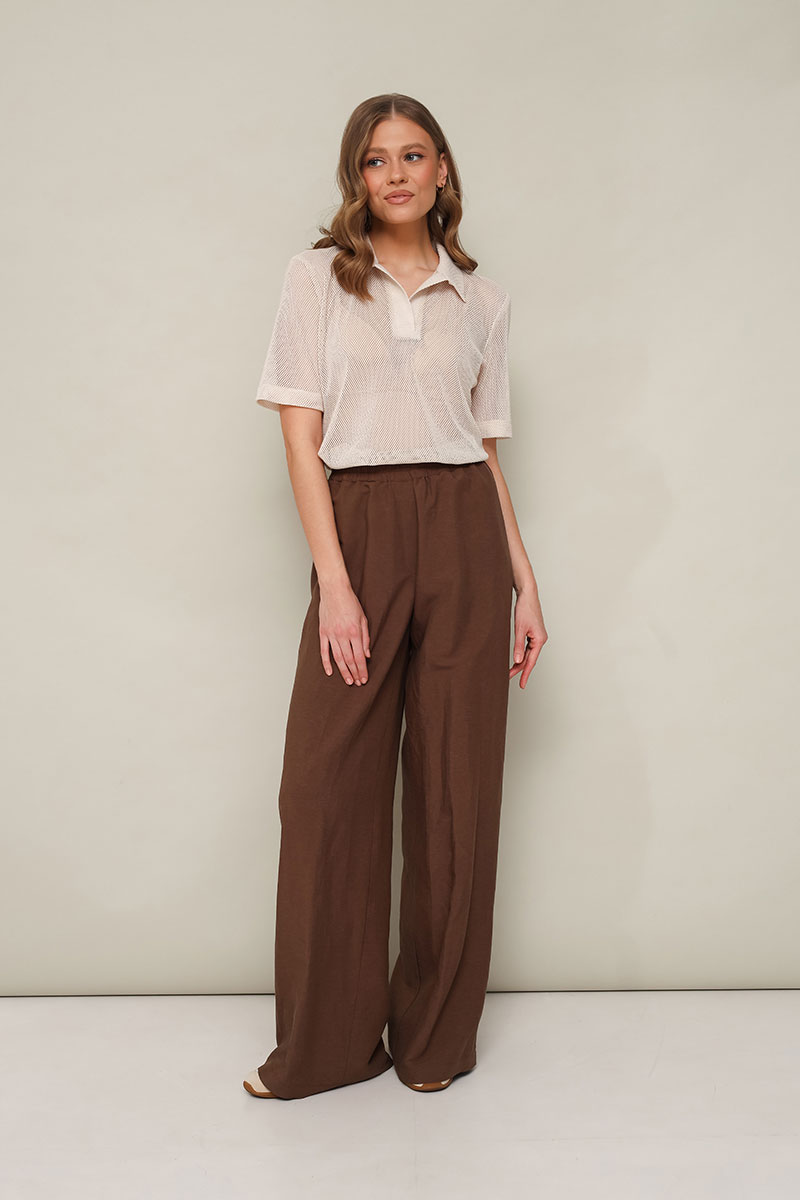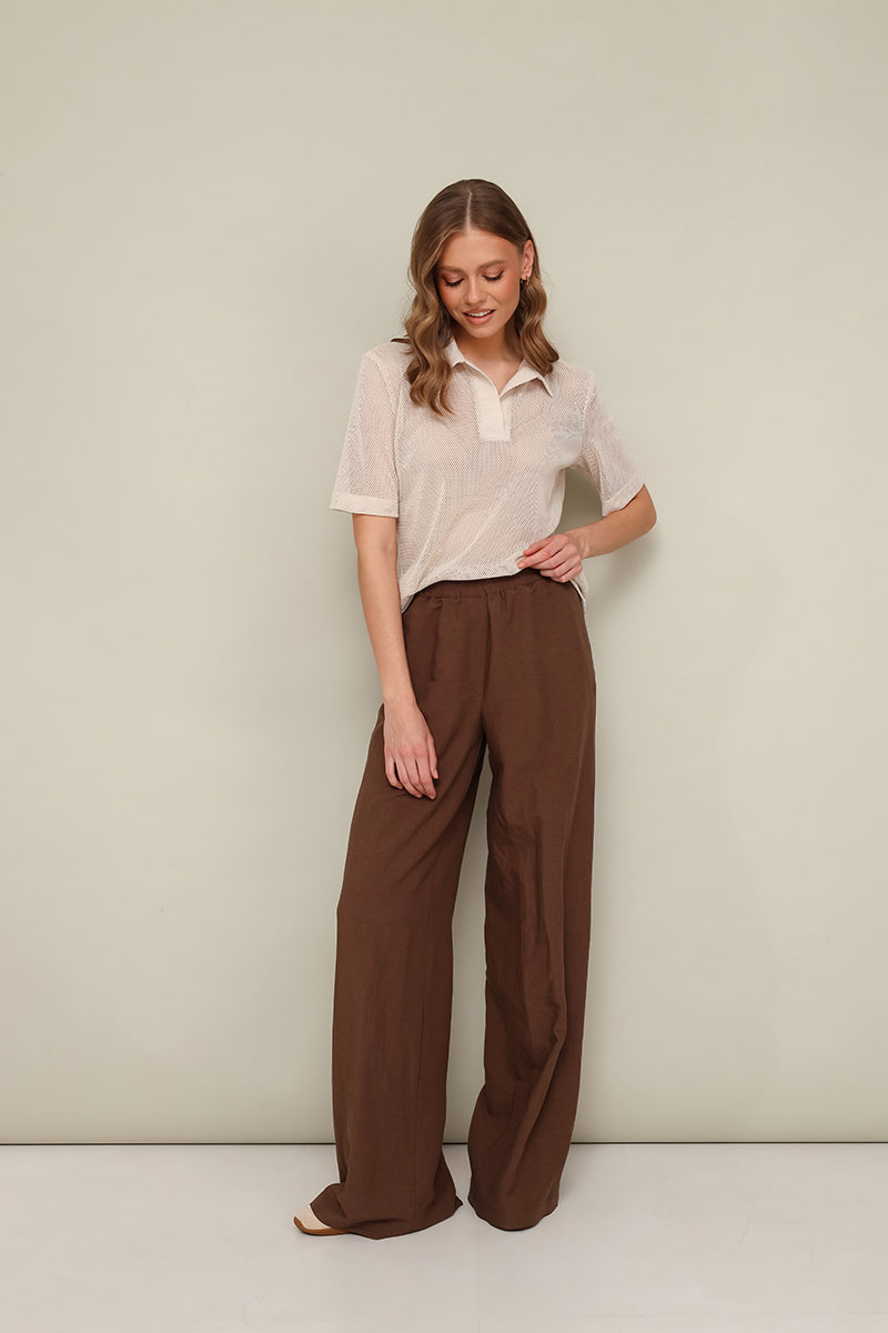 Брюки прямого силуэта с боковыми наклонными карманами, спереди обработана имитация гульфика. Пояс притачной на резинке, для регуляции размера.