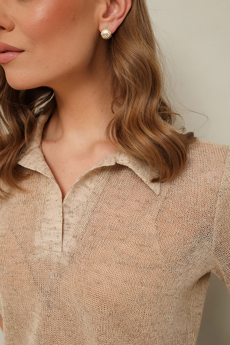 Поло с отложным воротником с цельнокроеной стойкой, V-образный вырез горловины обработан притачными планками. Короткие втачные рукава.