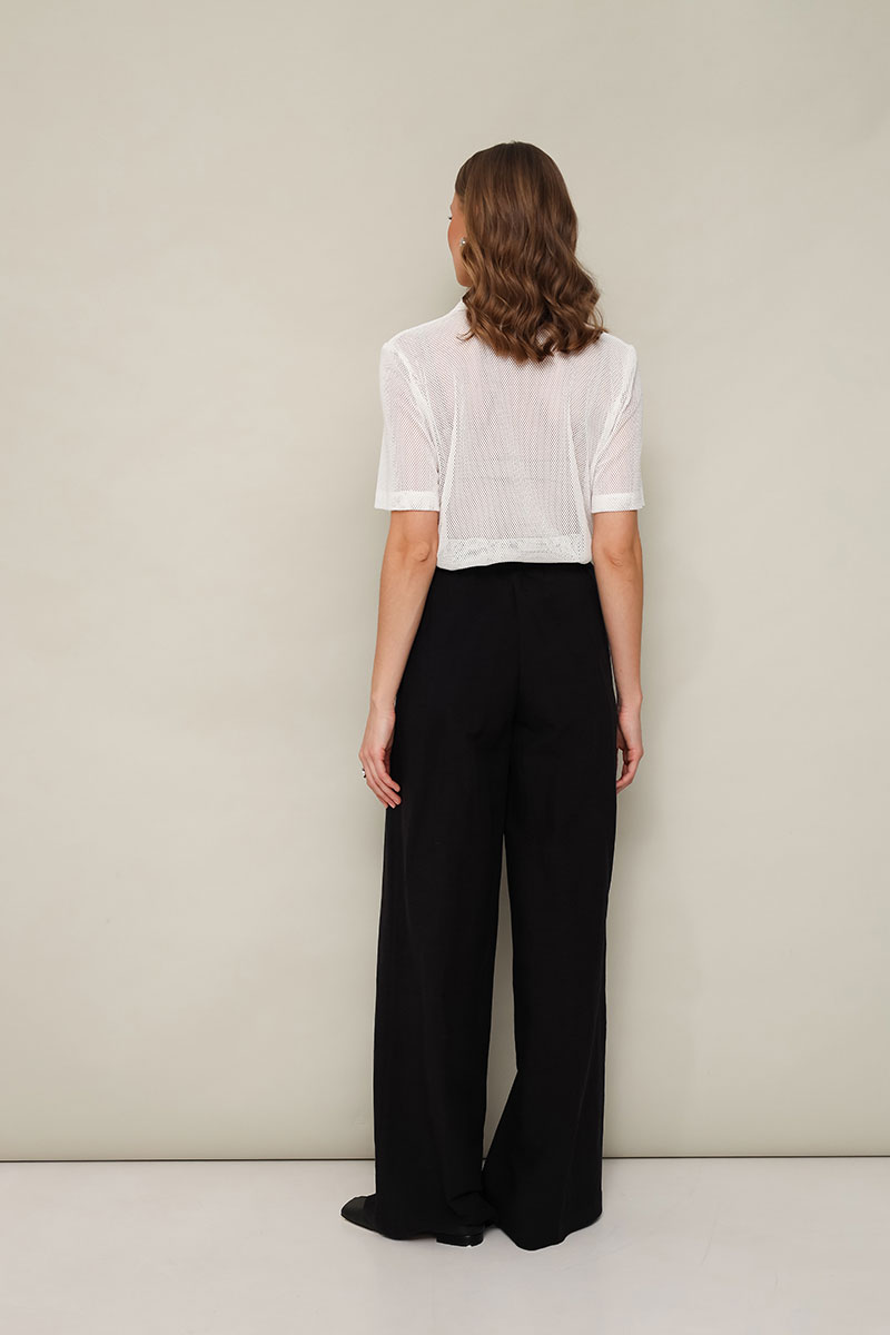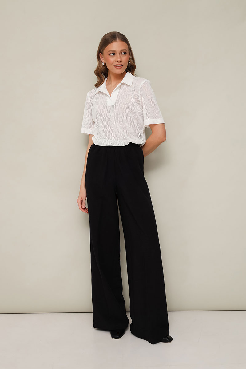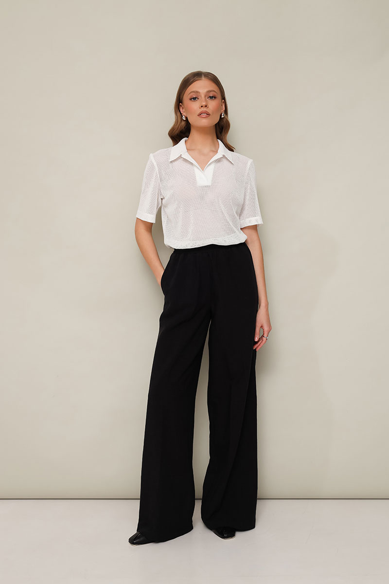 - Состав: поло: ПЭ 68%; вискоза 31%; спандекс 1%; брюки: лен 55%; вискоза 45%
