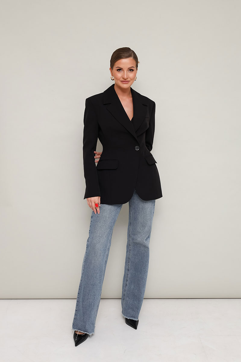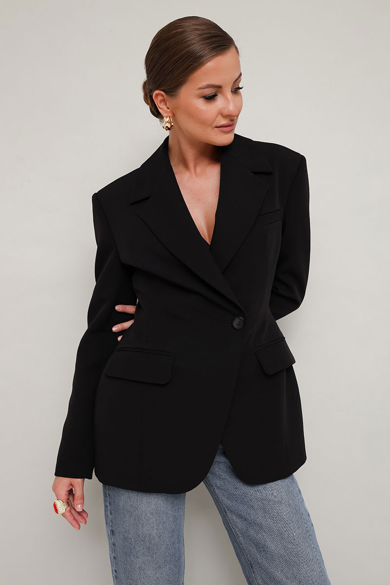 Силуэтный жакет с подчеркнутой линией талии. Смещенная застежка на петлю и пуговицу. Воротник пиджачного типа с отложными лацканами, край борта скругленный по низу жакета. Спереди обработаны прорезные карманы в рамку с клапанами и нагрудный прорезной карман с листочкой. Рукава втачные, двухшовные с отлетнымм шлицами. Спинка с рельефами и средним швом, переходящим в шлицу. Изделие на подкладке.