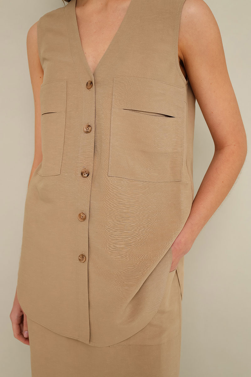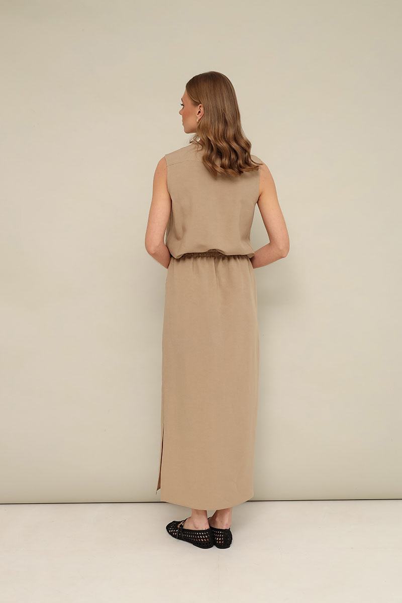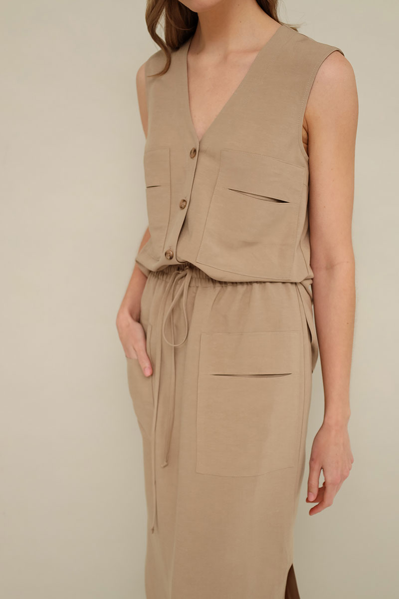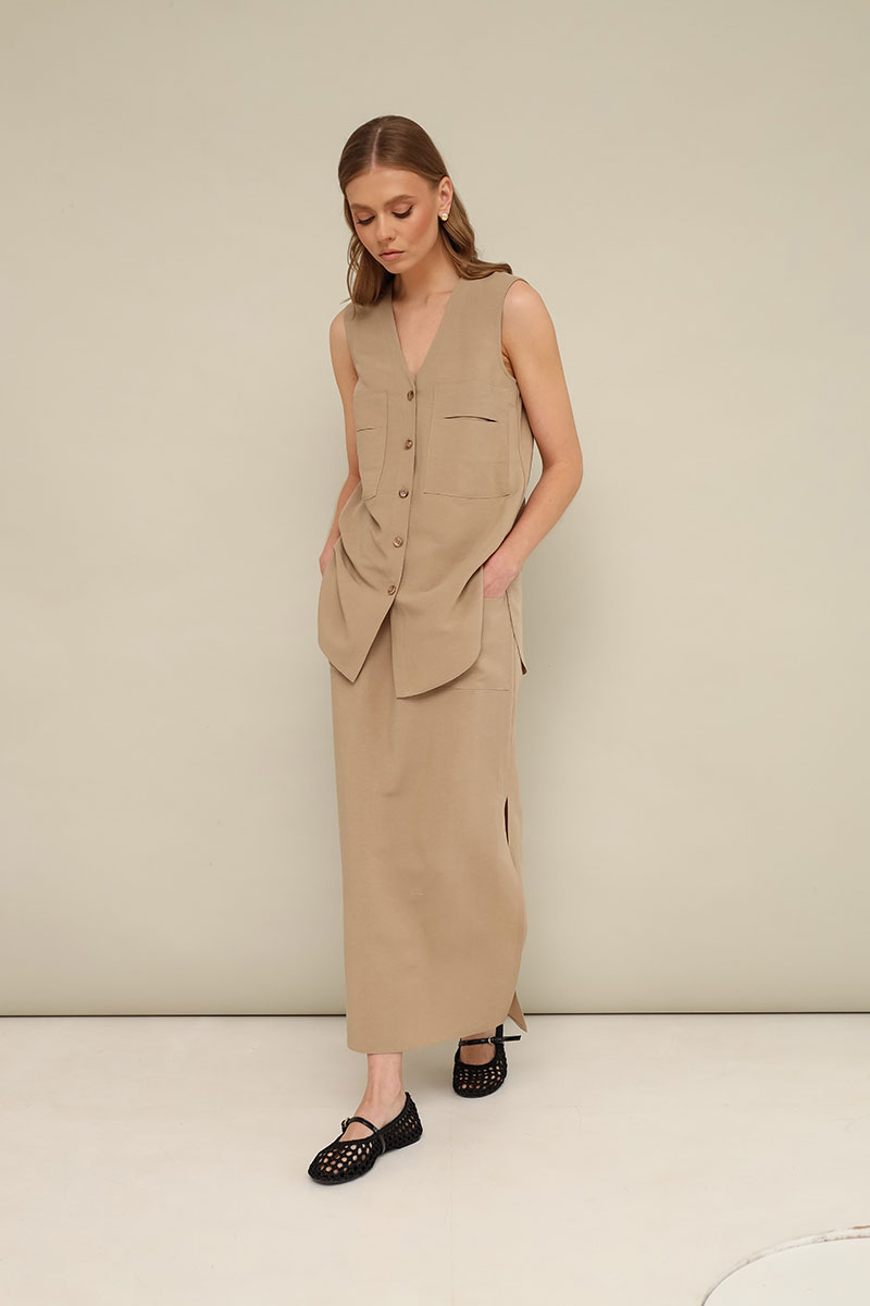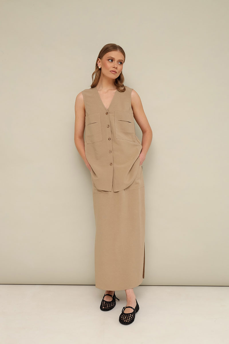 Юбка прямого силуэта с притачным поясом на резинке с завязками. По переду блузки и юбки обработаны накладные карманы. В боковых швах юбки - высокие разрезы.