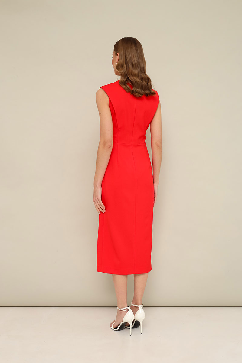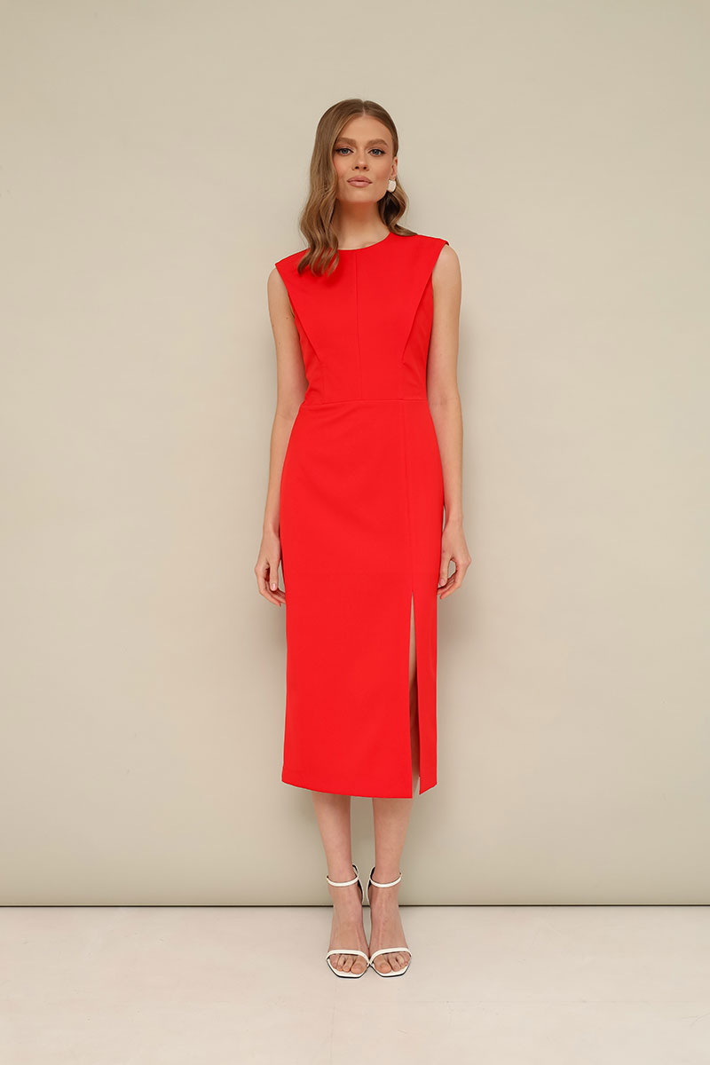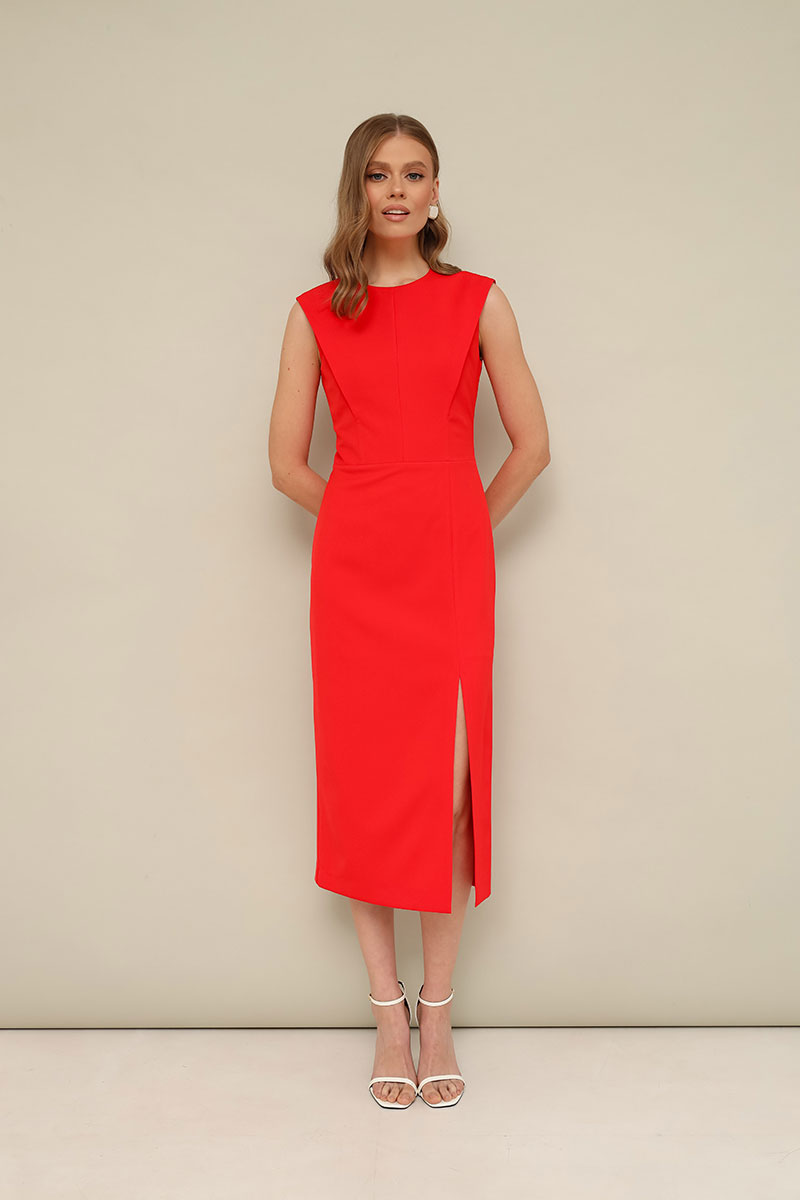 Лаконичное платье прилегающего силуэта, отрезное по талии, выполнено из плательной ткани. Округлый вырез горловины. Лиф по переду и спинке с конструктивными складками в рельефах. Юбка с высоким разрезом по левой стороне. Застежка в среднем шве спинки на потайную молнию. Платье обработано подкладкой.