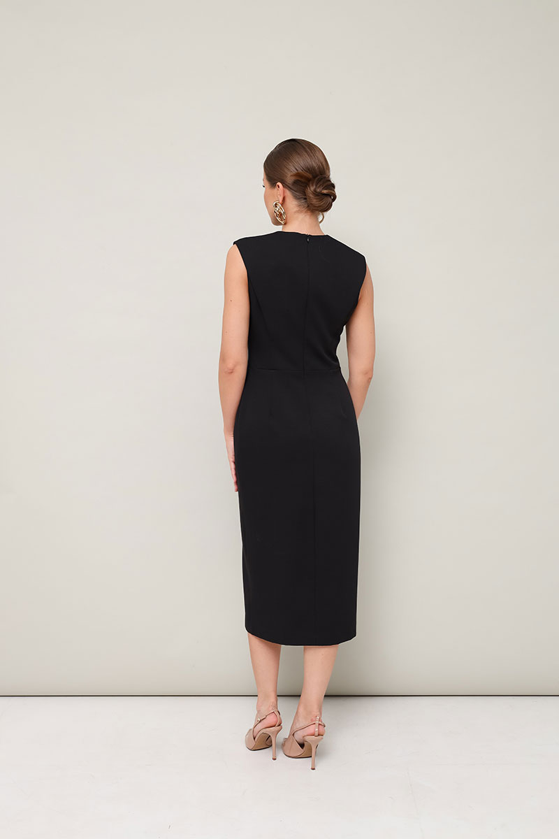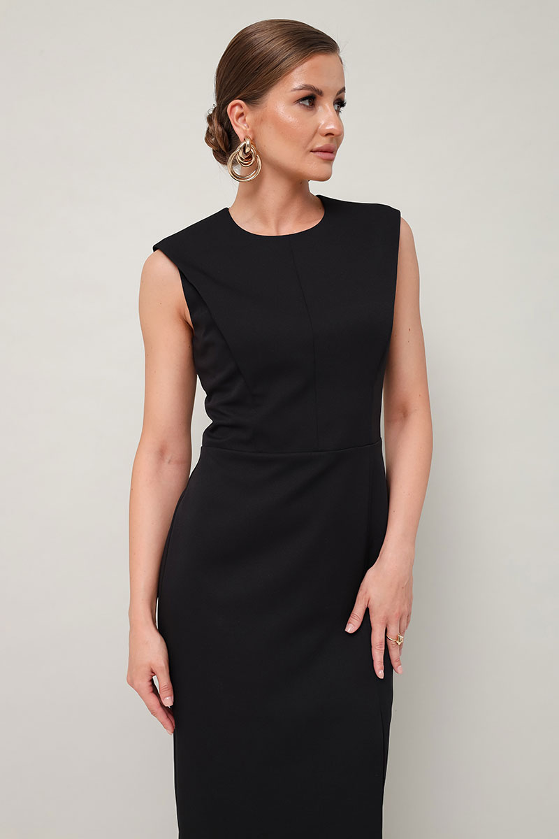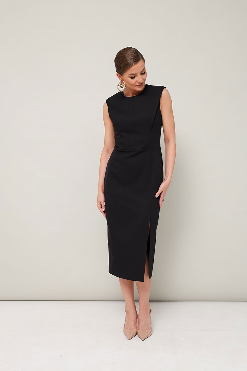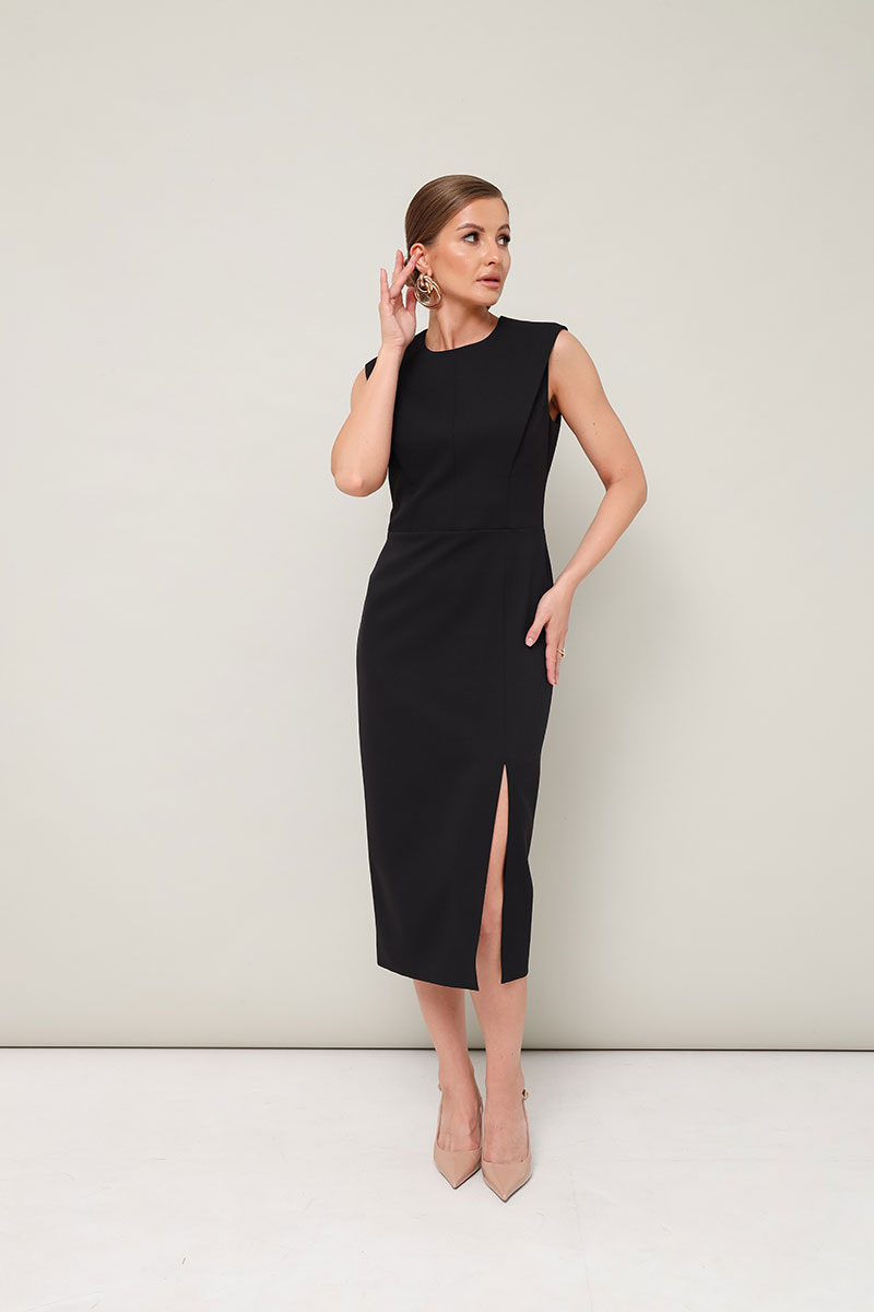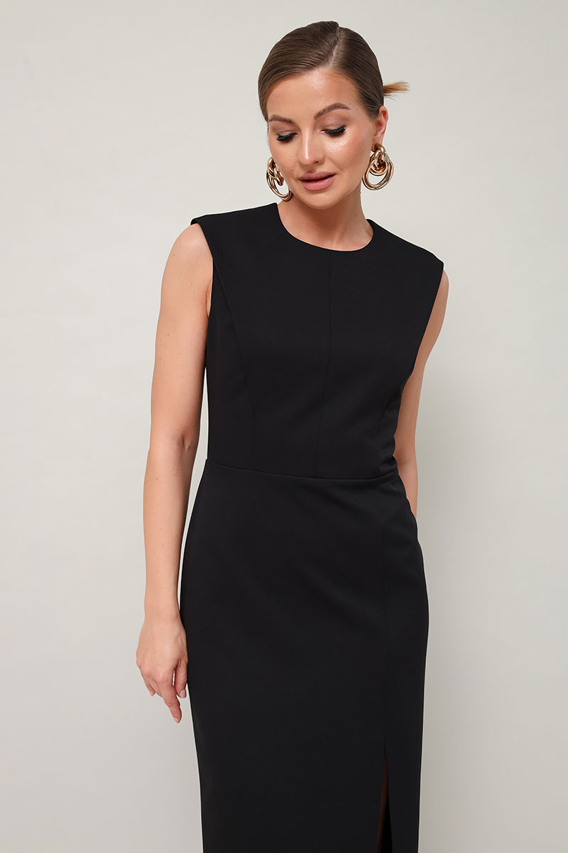 Лаконичное платье прилегающего силуэта, отрезное по талии, выполнено из плательной ткани. Округлый вырез горловины. Лиф по переду и спинке с конструктивными складками в рельефах. Юбка с высоким разрезом по левой стороне. Застежка в среднем шве спинки на потайную молнию. Платье обработано подкладкой.