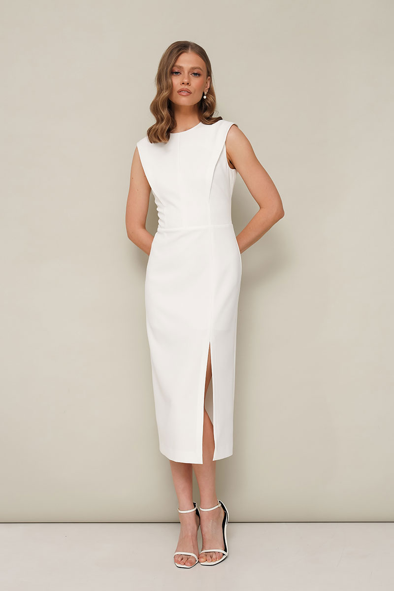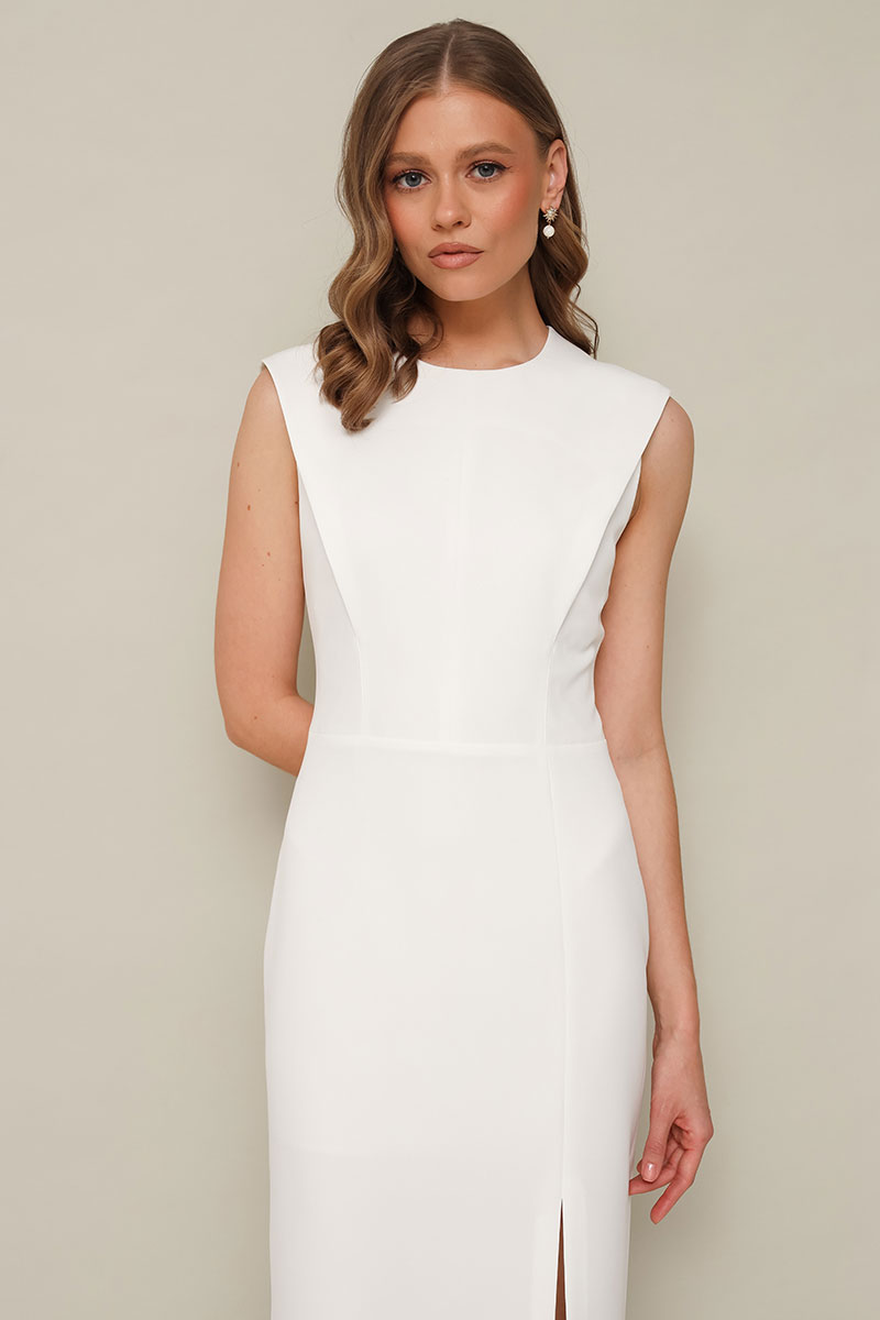 Лаконичное платье прилегающего силуэта, отрезное по талии, выполнено из плательной ткани. Округлый вырез горловины. Лиф по переду и спинке с конструктивными складками в рельефах. Юбка с высоким разрезом по левой стороне. Застежка в среднем шве спинки на потайную молнию. Платье обработано подкладкой.