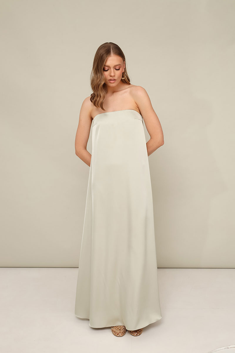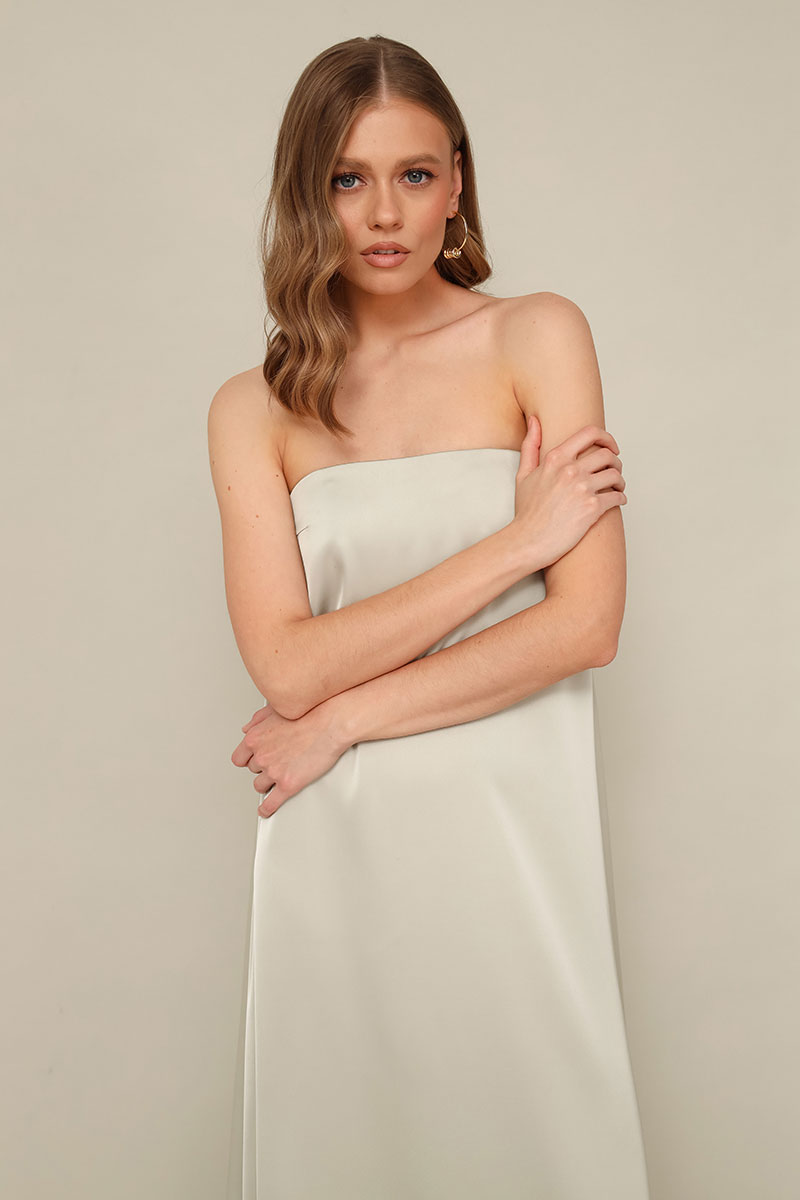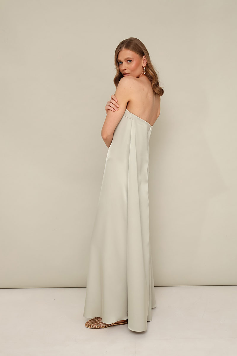 Элегатное А-образное платье в длине макси, выполнено из струящейся ткани с благородным матовым блеском. Лиф с корсетными чашками, по спинке обработана потайная застежка на резинку с крючками, для комфортного прилегания лифа по линии груди. В среднем шве спинки застежка на потайную молнию. В комплекте прилагаются силиконовые бретельки.