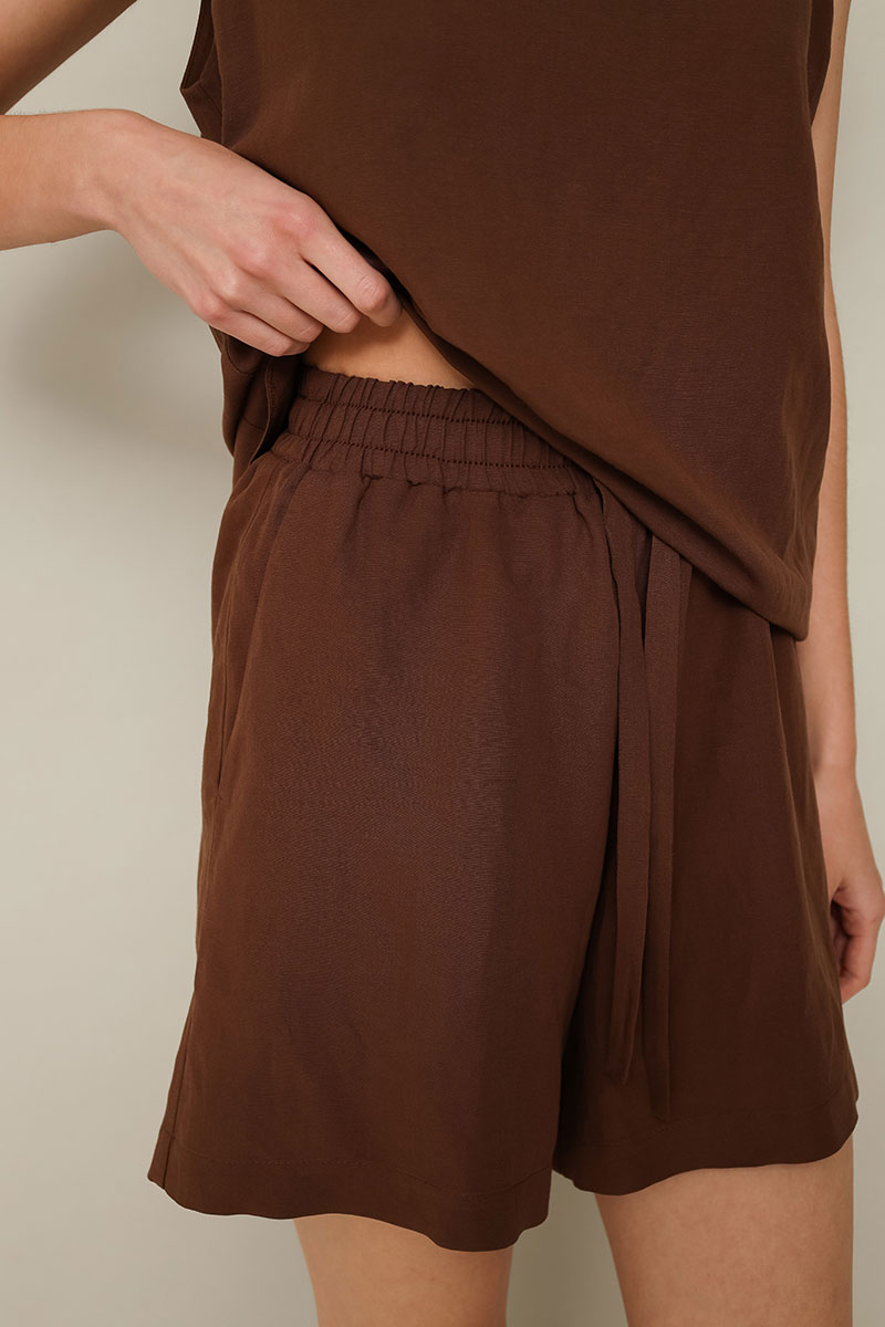Шорты с притачным поясом на резинке с декоративной завязкой, в боковых швах обработаны наклонные карманы.