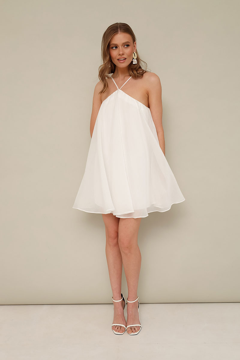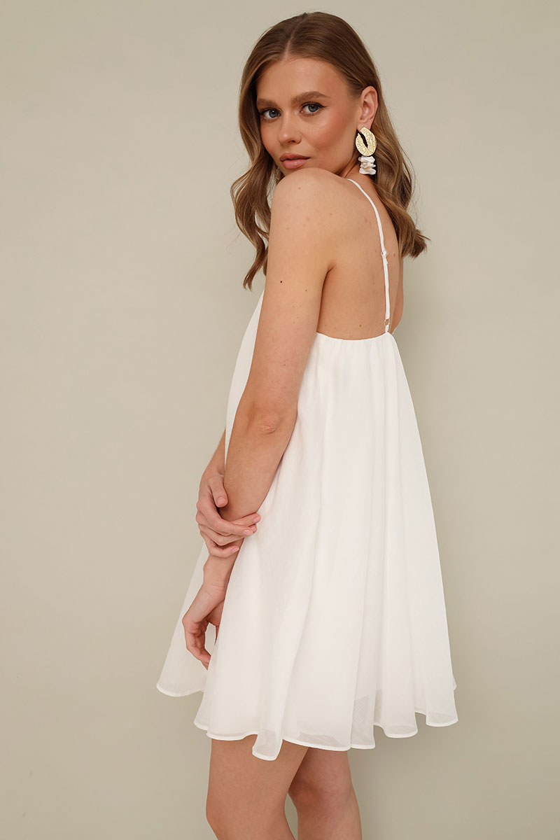 Летнее платье А-образного силуэта, в длине мини. Лиф с фигурным вырезом, на бретельках с регуляторами. Платье из натуральной вискозы, нижнее платье-футляр выполнено из струящейся ткани с благородным блеском. Застежка в среднем шве спинки на потайную молнию.