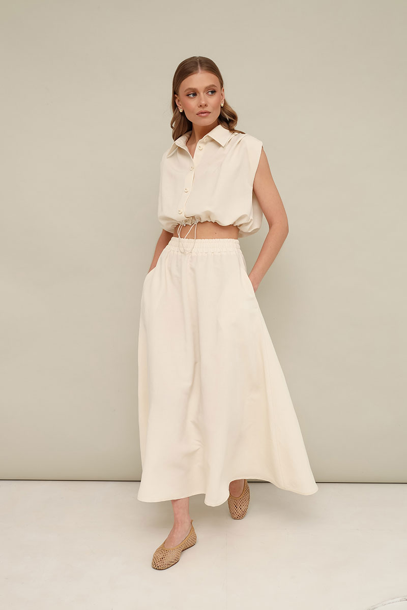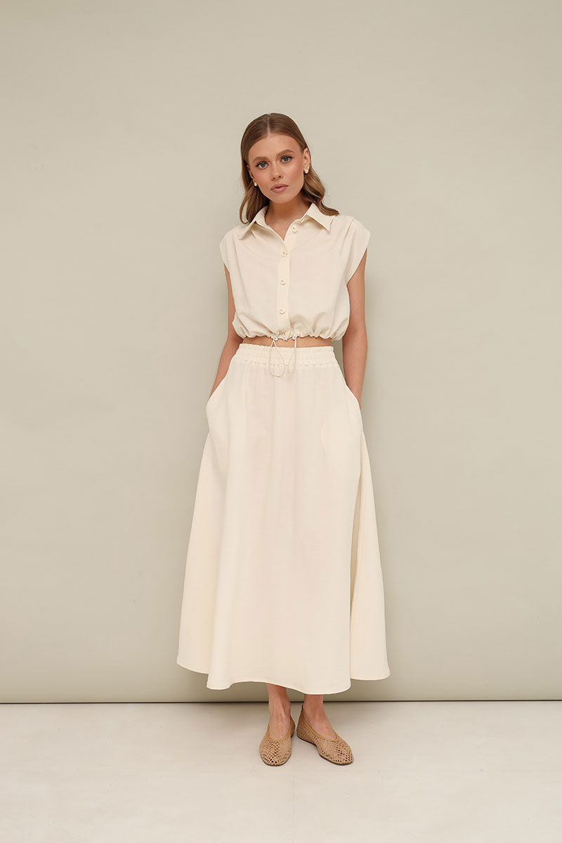 Юбка А-силуэта в длине миди. Притачной пояс на резинке, боковых швах обработаны наклонные карманы.