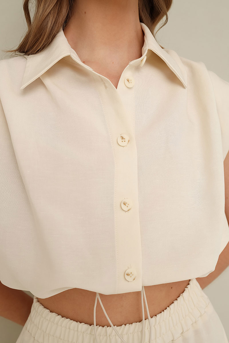 Блузка прямого силуэта с кулисой и фиксатором на талии. Отложной воротник со стойкой, застежка центральная на петли и пуговицы, по плечевым швам заложены складки.