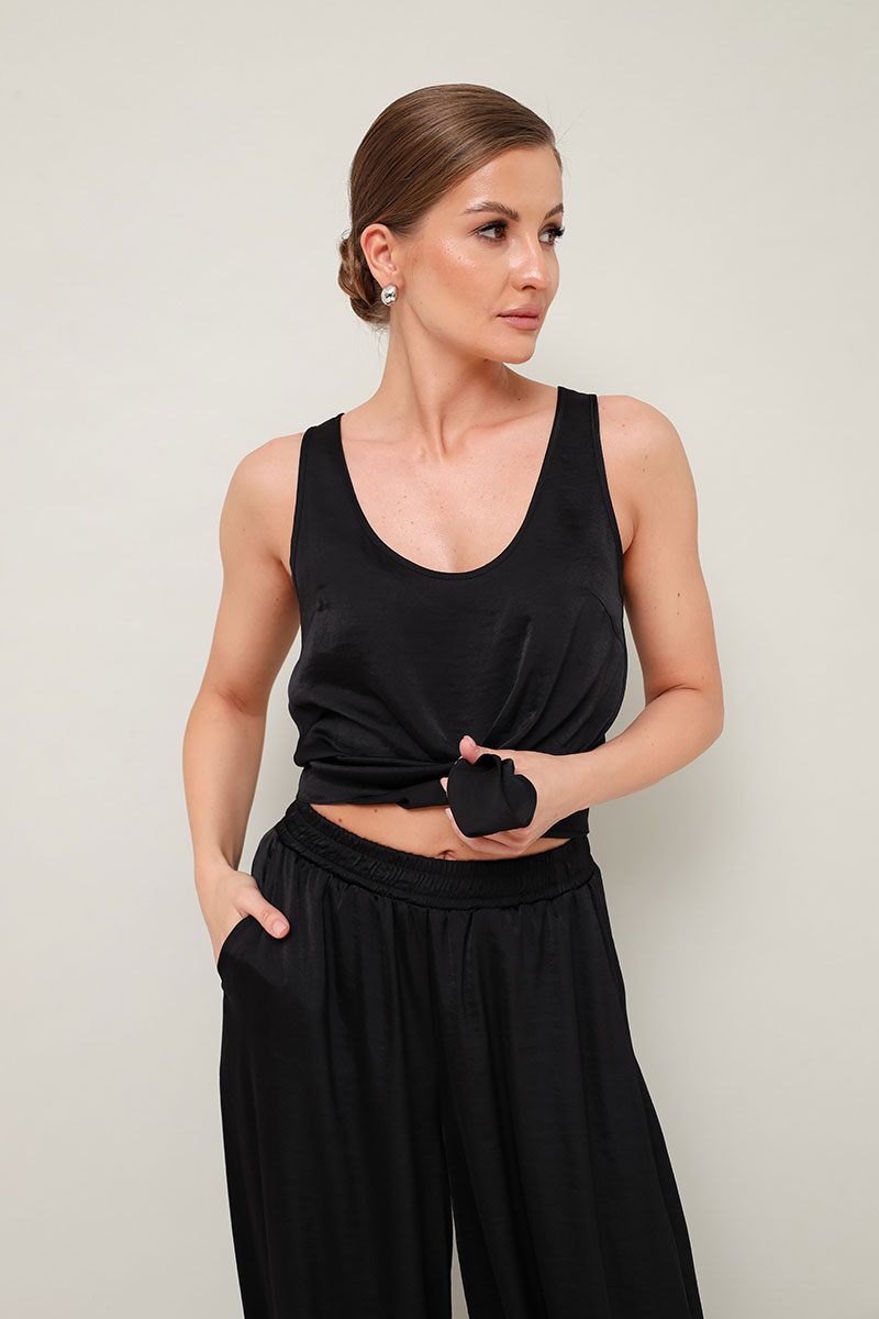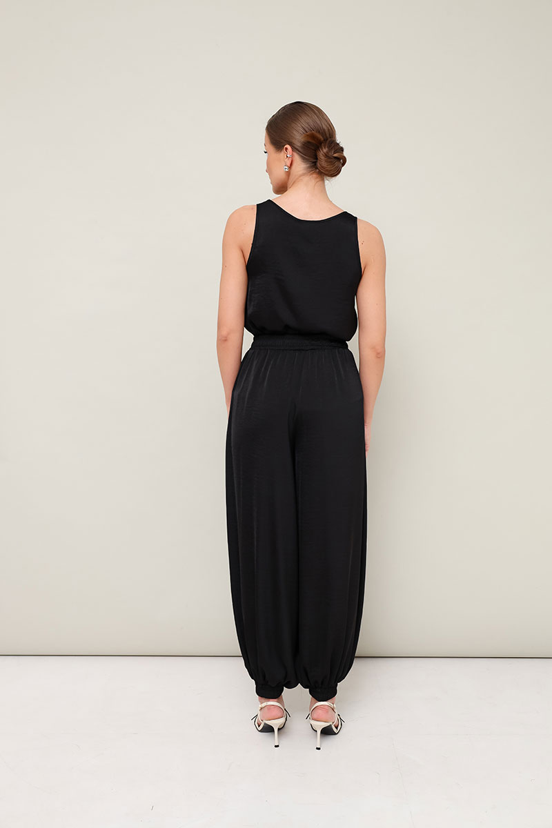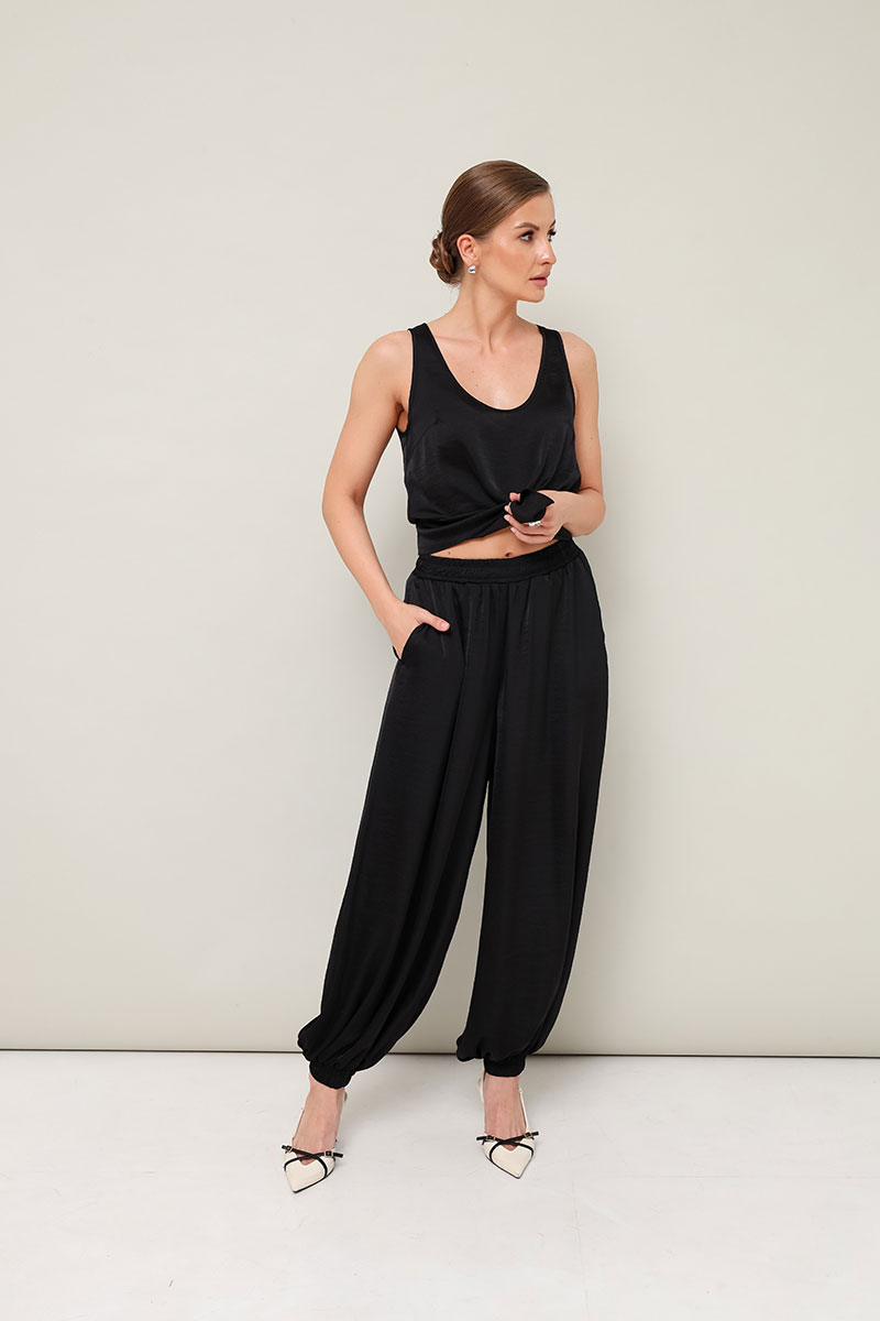 Стильный 2-предметный комплект: топ и брюки алладины, выполнен из струящейся ткани с матовым блеском. Топ прямого кроя на бретелях. Комфортные брюки свободного силуэта с боковыми наклонными карманами. Притачной пояс и манжеты на резинке.