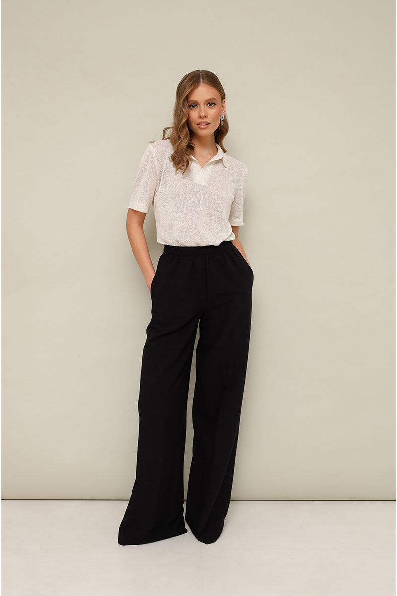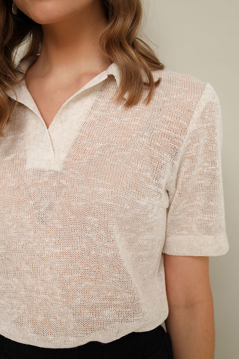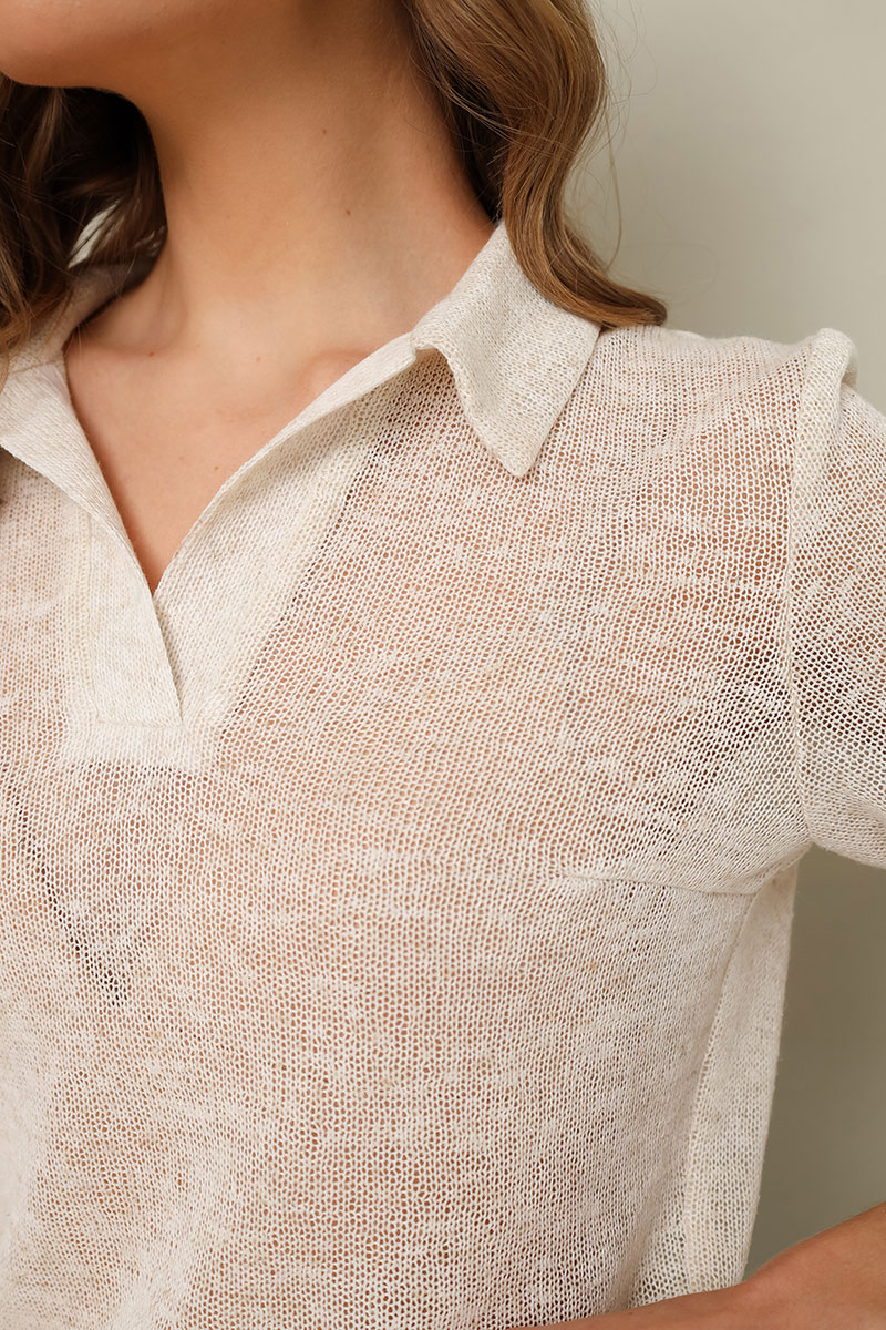 Поло с отложным воротником с цельнокроеной стойкой, V-образный вырез горловины обработан притачными планками. Короткие втачные рукава.