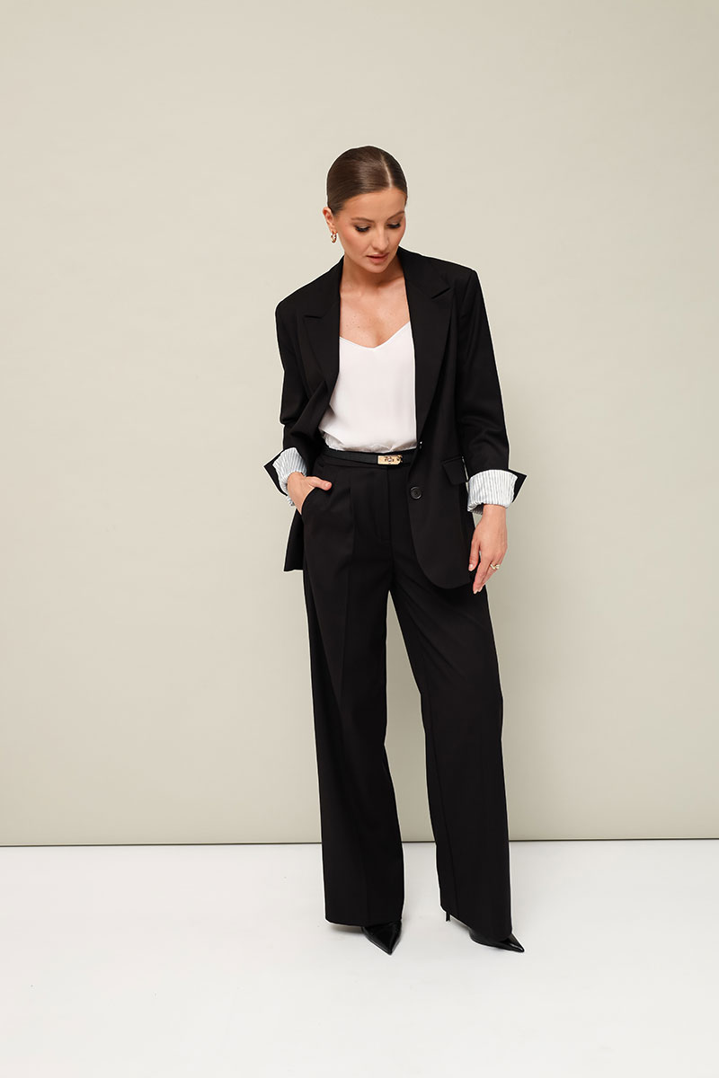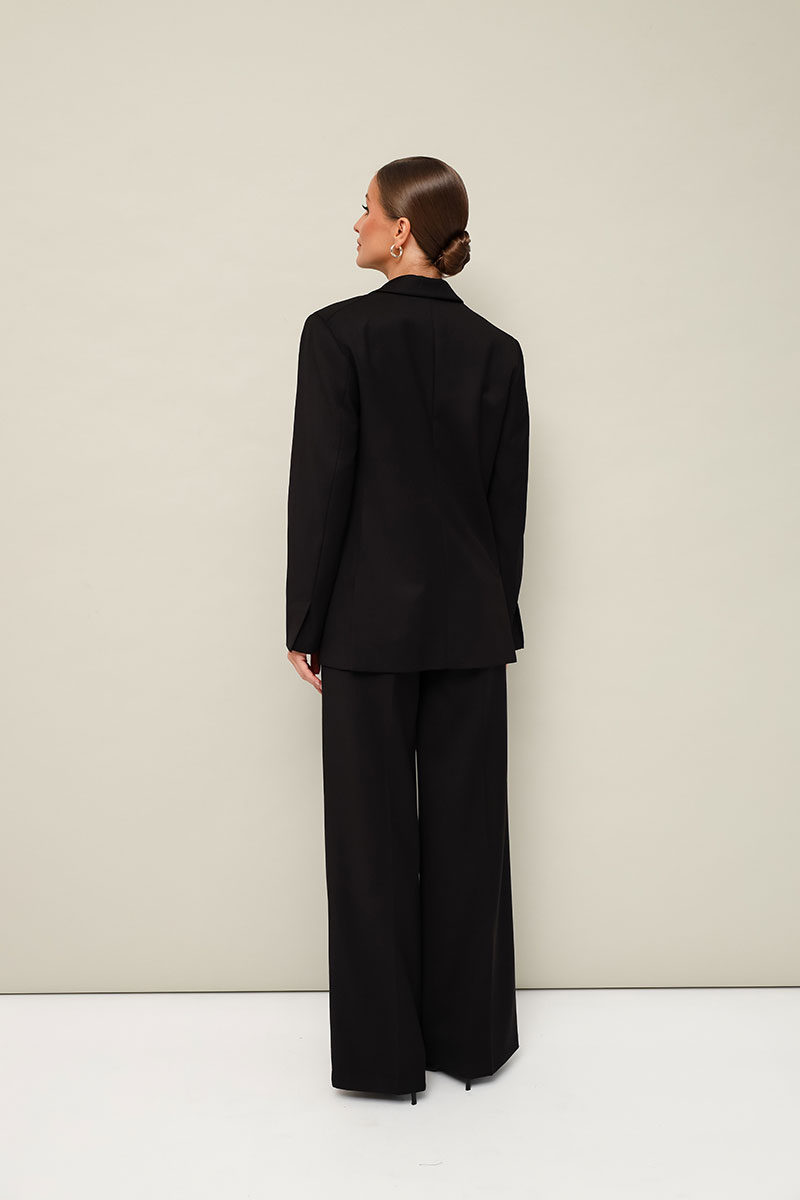 Стильный 2-предметный комплект, состоящий из жакета и брюк, выполнен из качественной костюмной ткани.