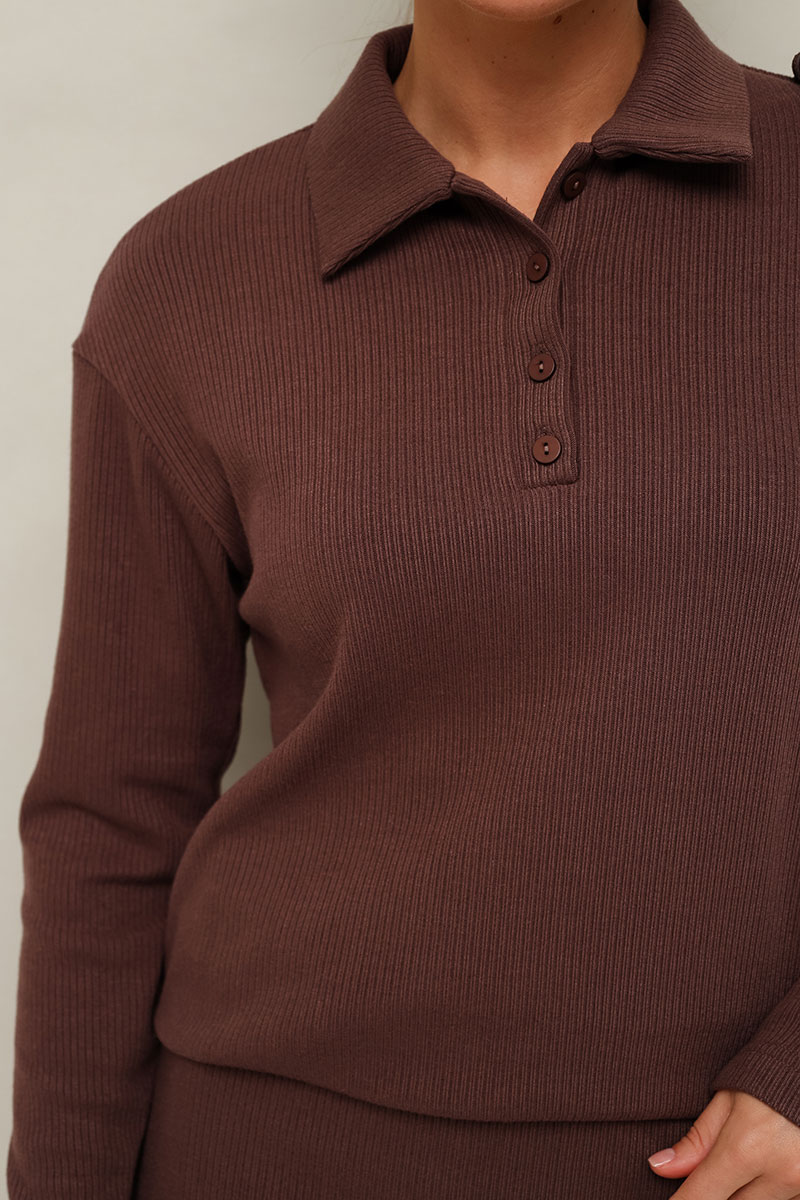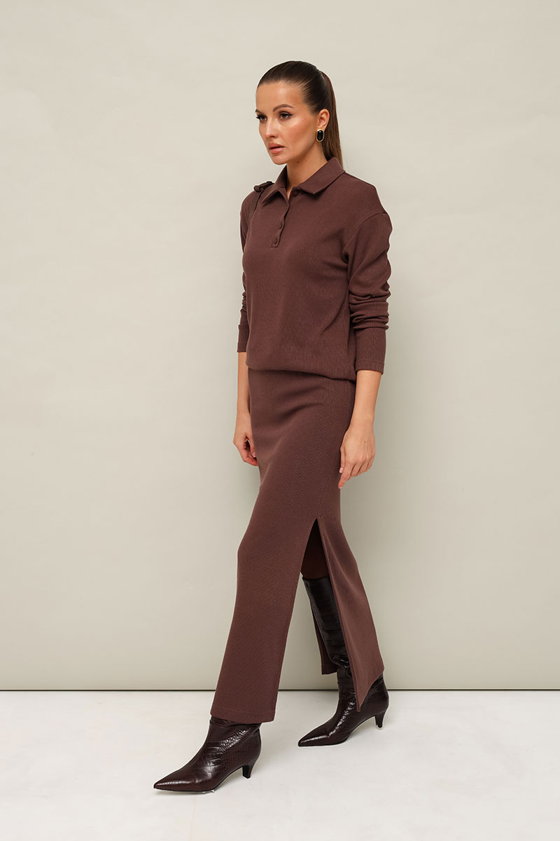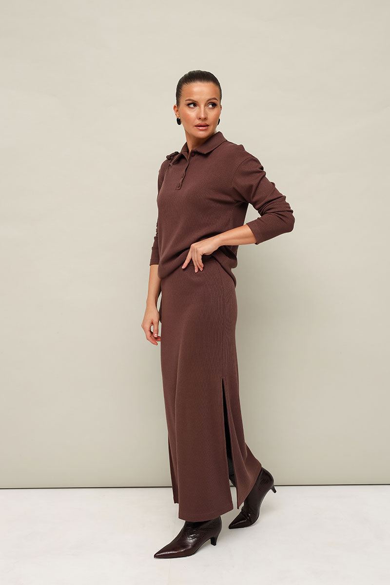 Комфортный трикотажный комплект, состоящий из поло и юбки.