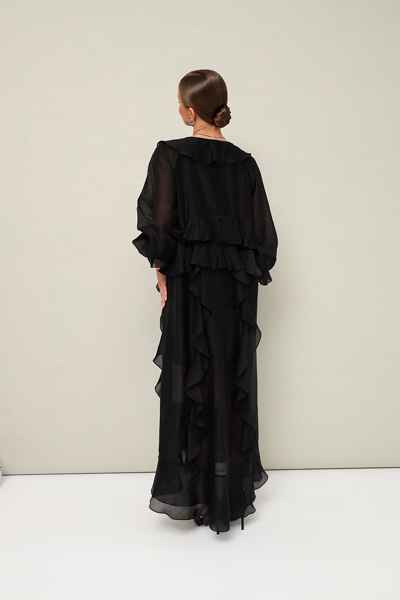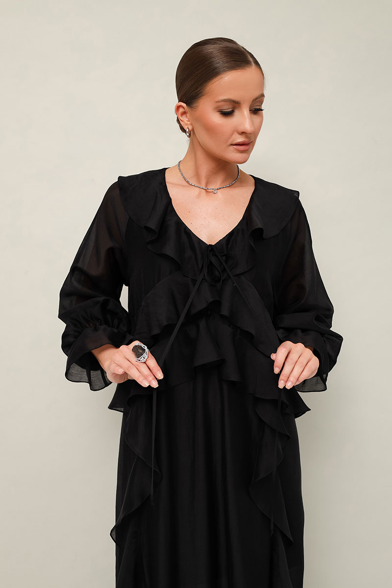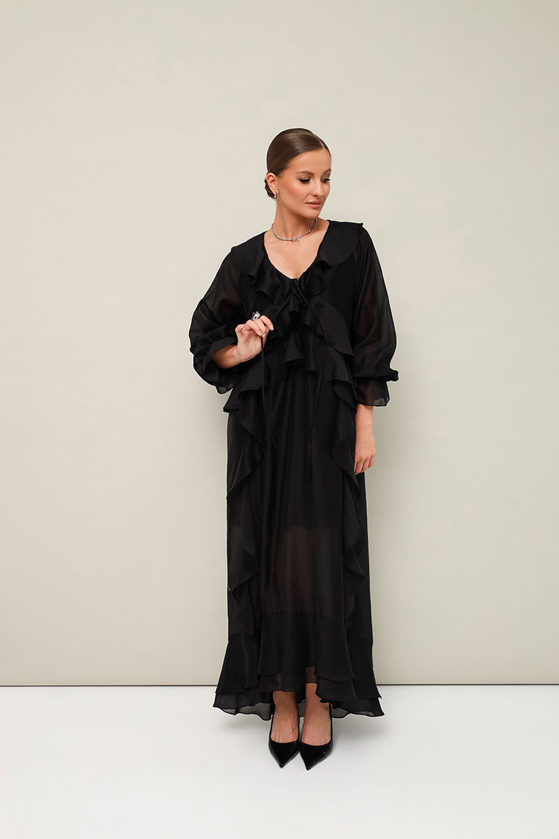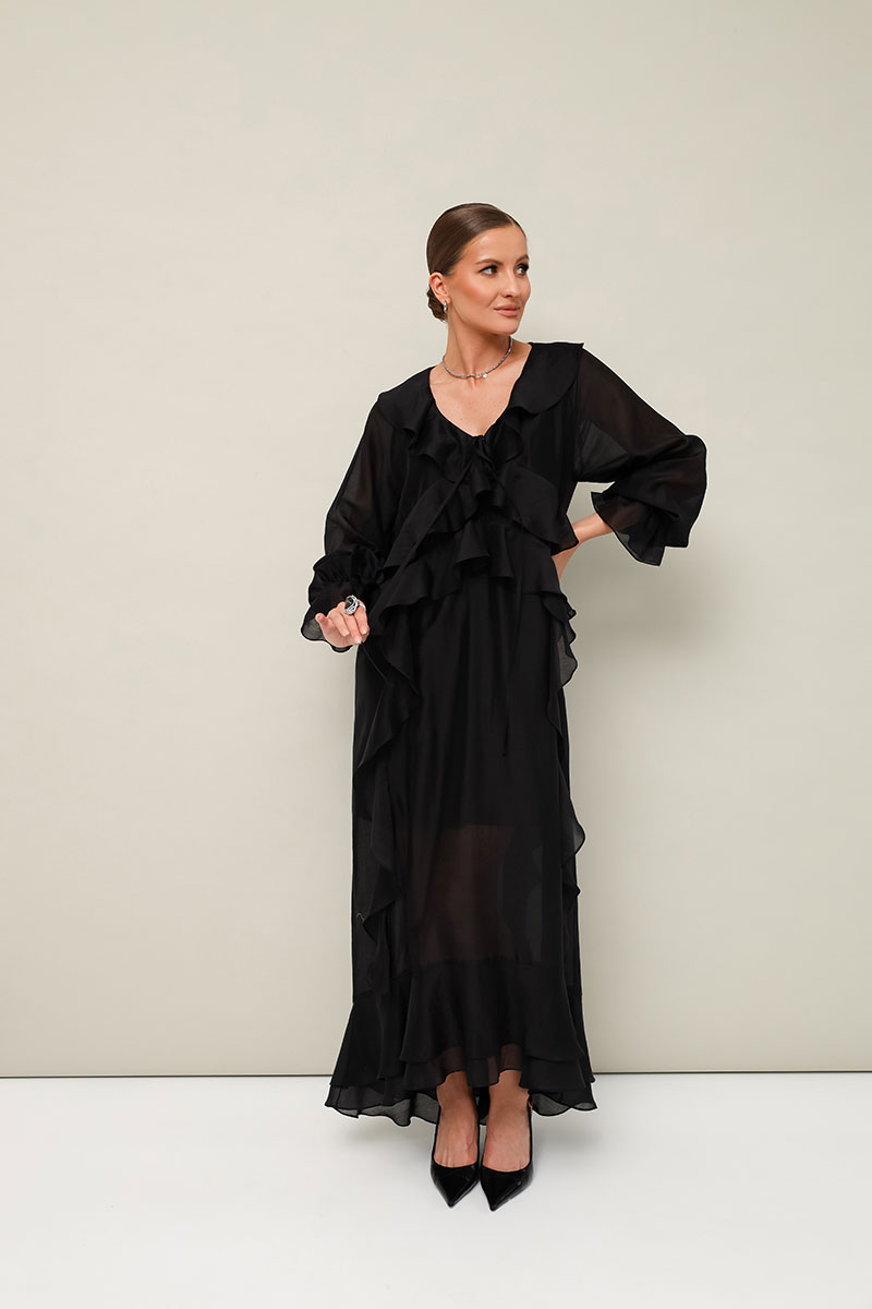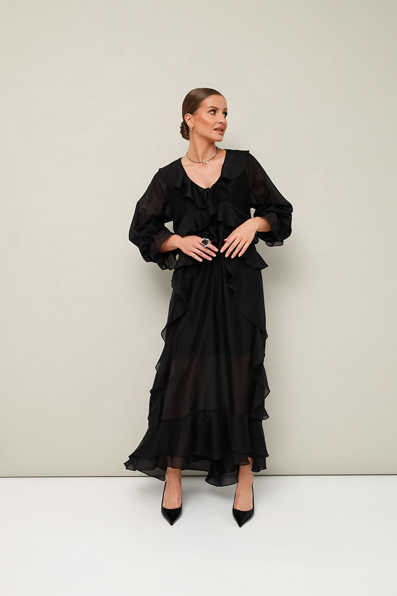 Летящее платье А-силуэта, выполнено из полупрозрачной вискозной ткани. Горловина с V-образным вырезом-каплей с завязками. Лиф переда с подрезами с воланами, переходящими на спинку. Юбка с вертикальными подрезами с воланами. Рукава-реглан с манжетами на резинке. Низ фигурной формы. Платье обработано подкладкой.