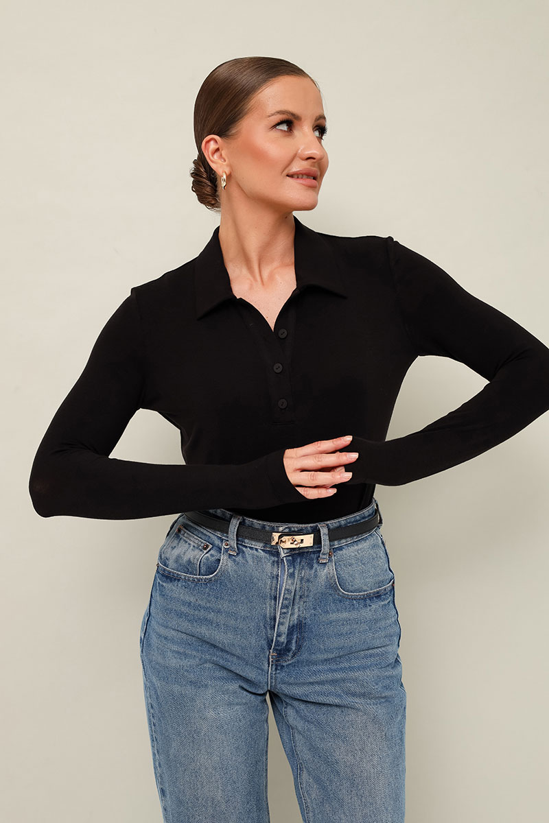 Трикотажное поло с отложным воротником с цельнокроеной стойкой. Вырез горловины обработан притачными планками с застежкой на петли и пуговицы. Втачные длинные рукава.