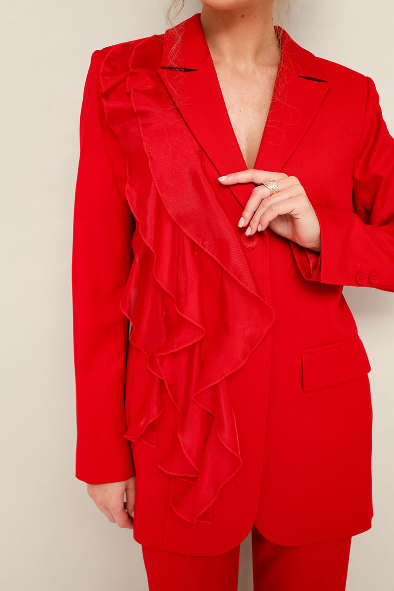 Жакет полуприлегающего силуэта, с центральной застежкой на петли и пуговицы. Воротник пиджачного типа с отложными лацканами, край борта скругленный по низу жакета. Спереди прорезной