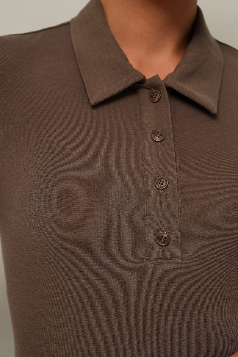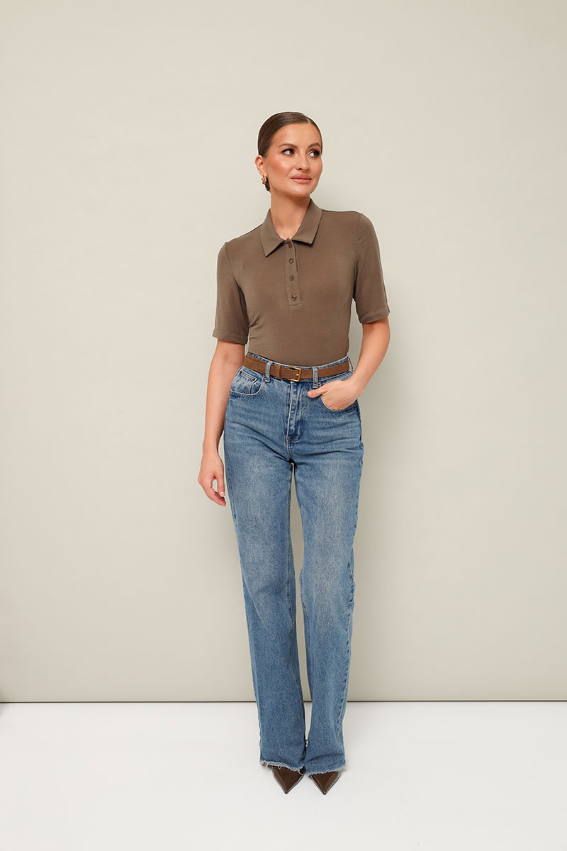 Трикотажное поло с отложным воротником с цельнокроеной стойкой. Вырез горловины обработан притачными планками с застежкой на петли и пуговицы. Короткие втачные рукава.
