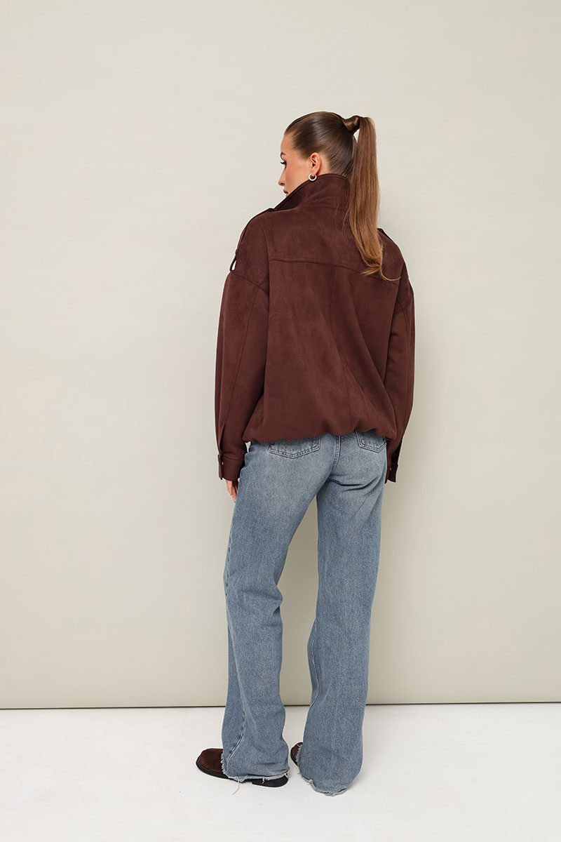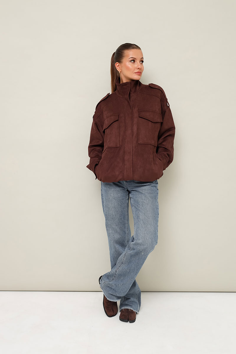 Бомбер актуального прямого кроя, выполнена из качественной экозамши. Воротник-стойка, центральная застёжка на молнию с притачной планкой. По плечевым швам паты. Спереди обработаны нагрудные накладные карманы с клапанами и прорезные карманы с листочкой. Рукава со спущенной линией втачивания плеча, по низу манжеты. Низ бомбера на резинке. Паты, центральная притачная планка и манжеты с застежкой на потайные кнопки. Спинка с кокеткой и средним швом. Бомбер на подкладке.