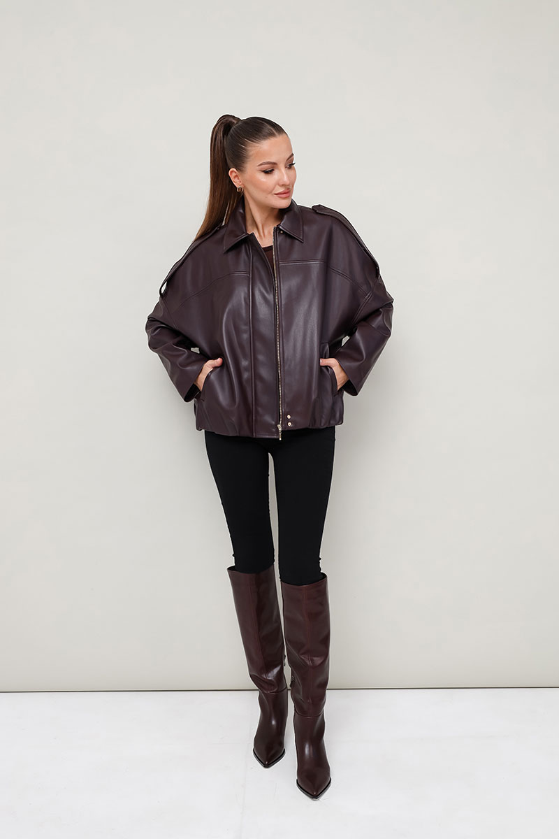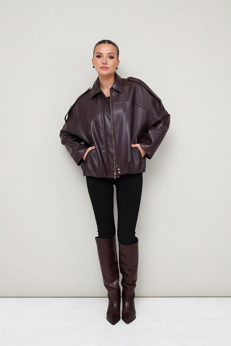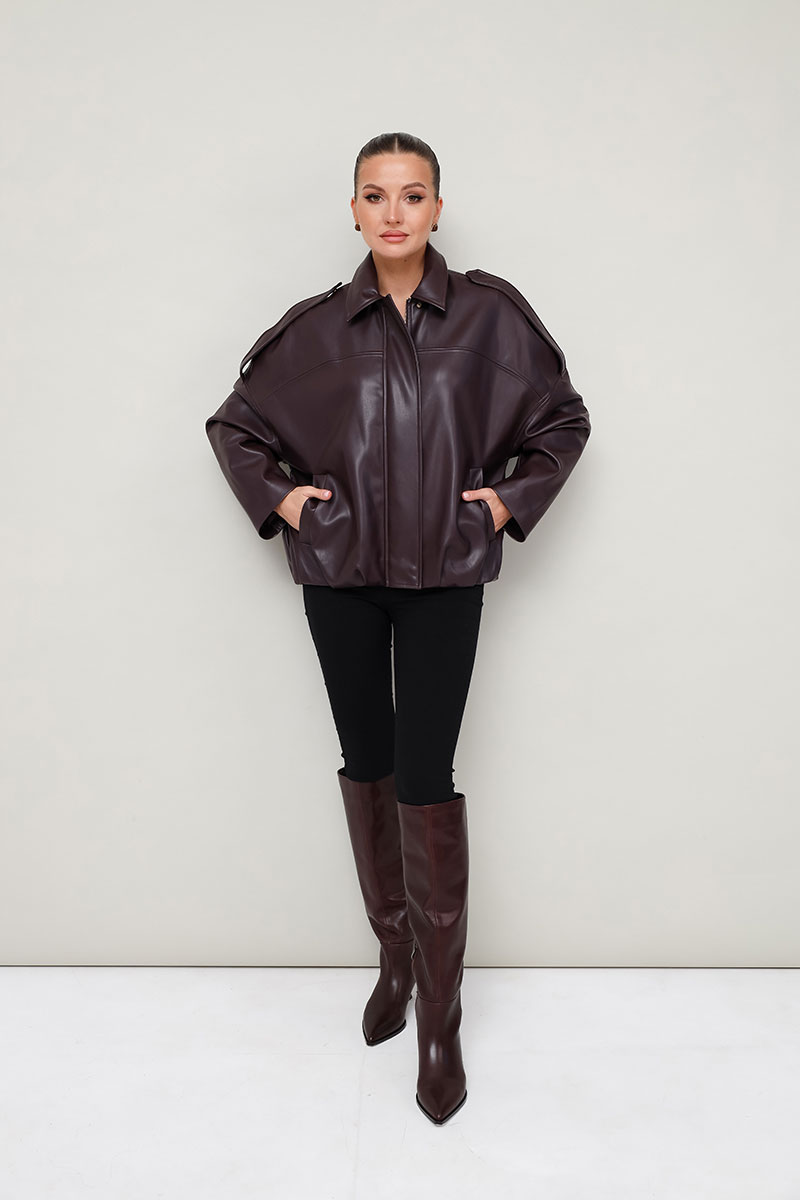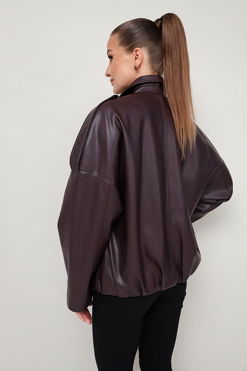 Женская куртка свободного силуэта, выполнена из экокожи высокого качества. Горловина с рубашечным воротником. Плечевые швы с патами на потайных кнопках. Центральная застёжка на металлическую молнию с защитной планкой на потайных кнопках. Спереди обработаны функциональное прорезные карманы с листочками. Двухшовные рукава со спущенной линией втачивания плеча. Спинка со средним швом. Низ собран на резинку для комфорта и регуляции размера. Куртка на подкладке.
