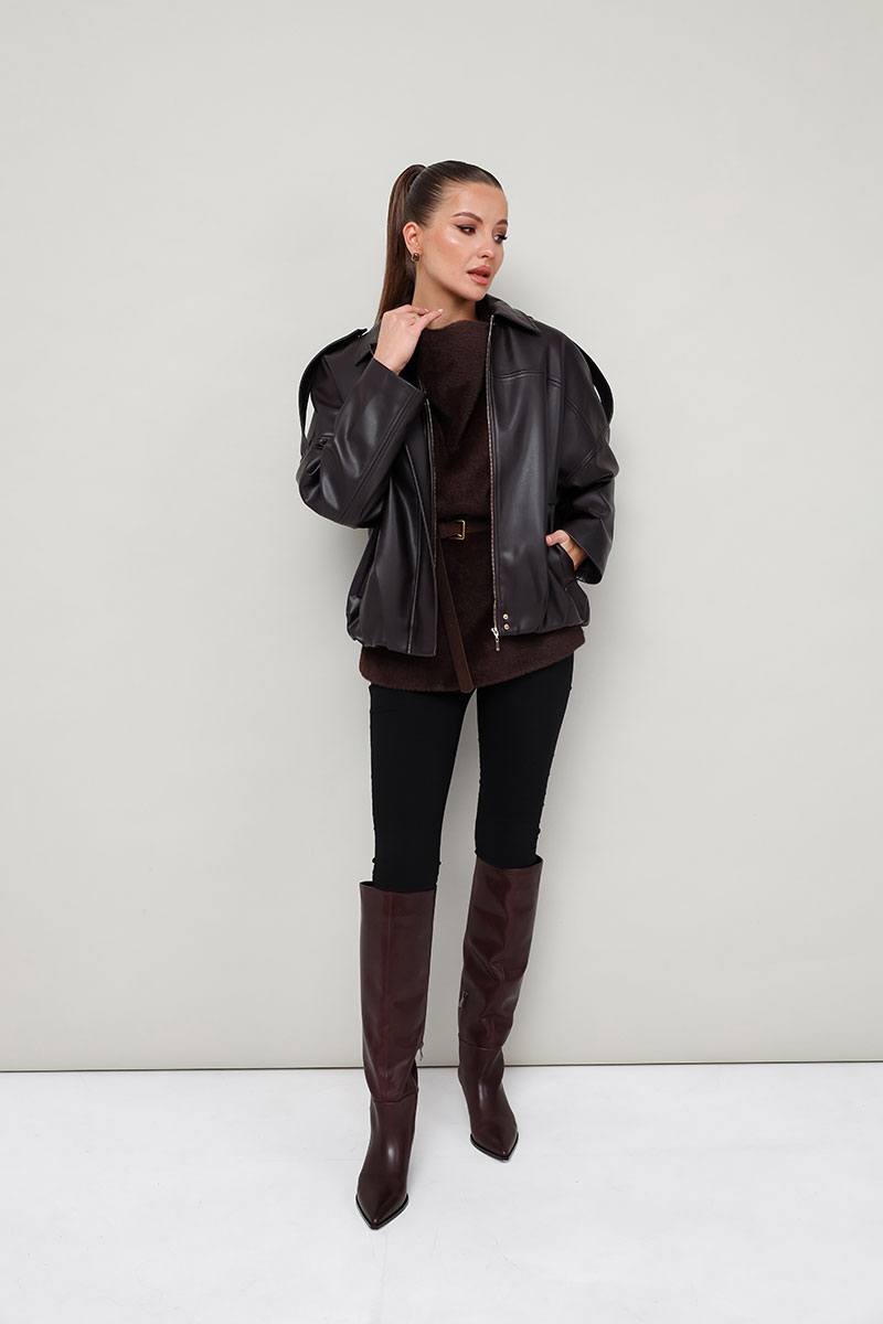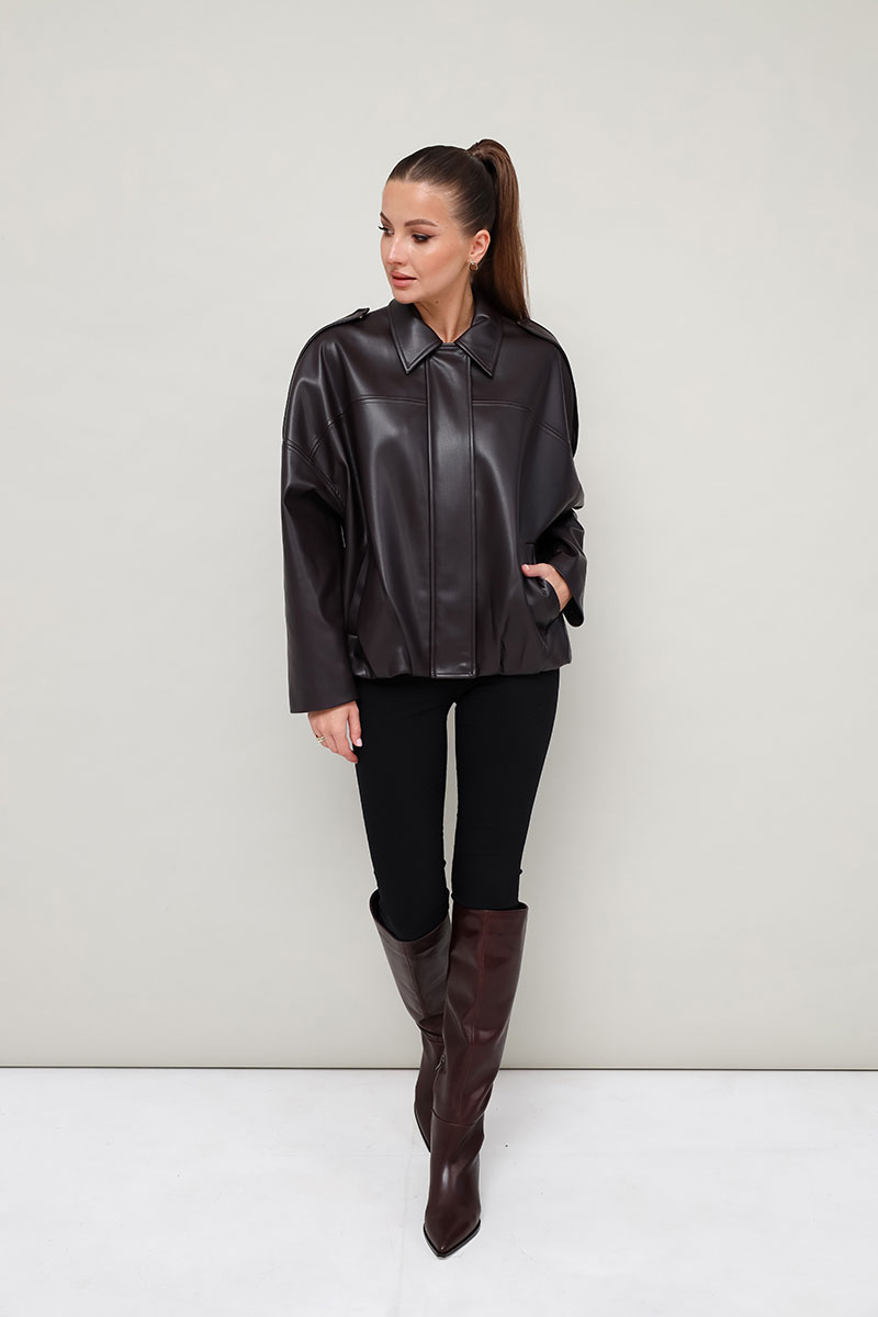 Женская куртка свободного силуэта, выполнена из экокожи высокого качества. Горловина с рубашечным воротником. Плечевые швы с патами на потайных кнопках. Центральная застёжка на металлическую молнию с защитной планкой на потайных кнопках. Спереди обработаны функциональное прорезные карманы с листочками. Двухшовные рукава со спущенной линией втачивания плеча. Спинка со средним швом. Низ собран на резинку для комфорта и регуляции размера. Куртка на подкладке.