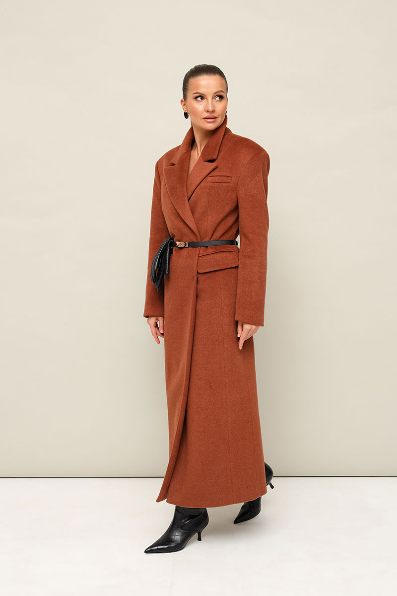 Демисезонное пальто прямого силуэта, выполнено из качественной пальтовой ткани. Воротник пиджачного типа с отложными лацканами. Двубортная застёжка на потайные пришивные кнопки. Слегка удлиненный плечевой шов. Спереди обработаны прорезные карманы в рамку с клапанами и нагрудный прорезной карман с листочкой. Рукава втачные, двухшовные. Спинка со средним швом, переходящим в шлицу. Пальто на подкладке.