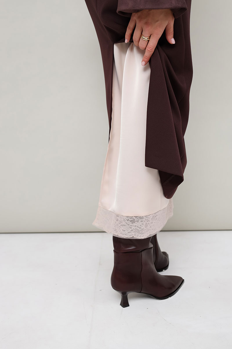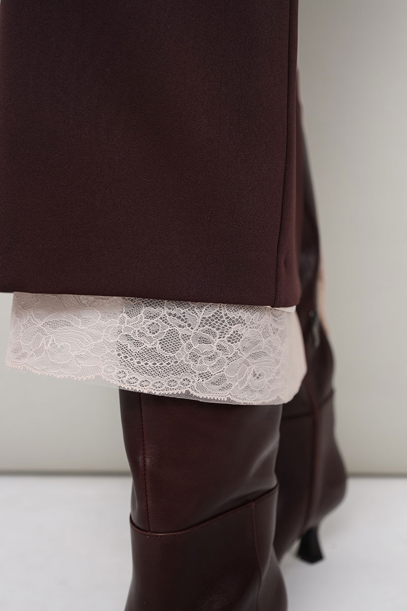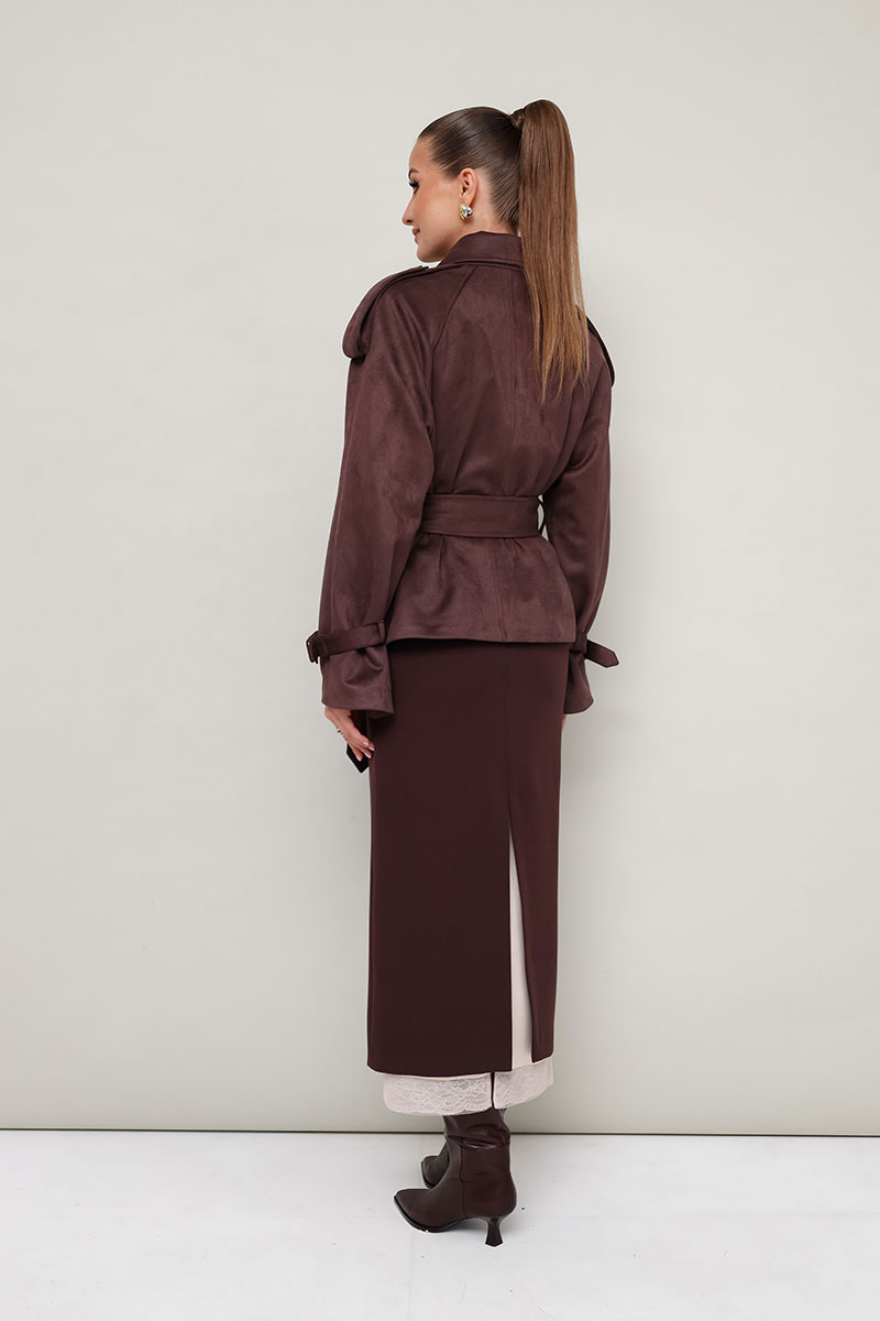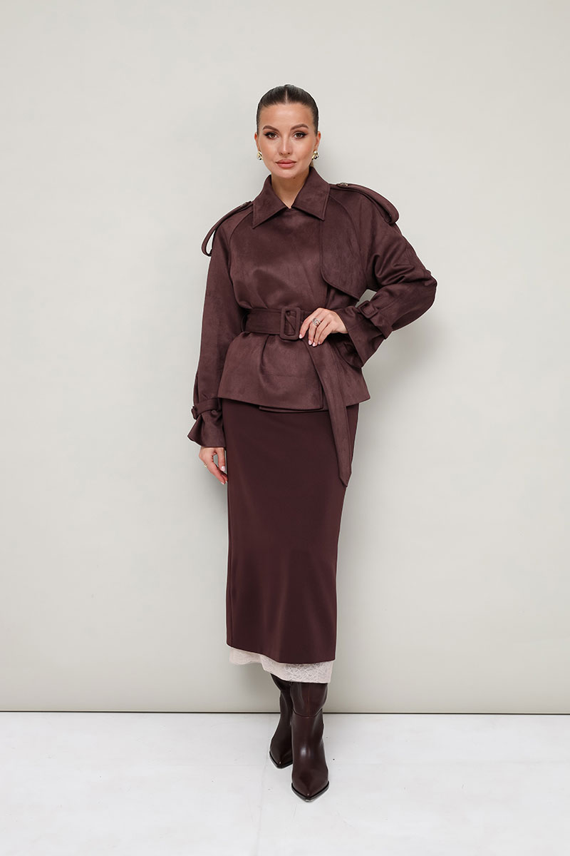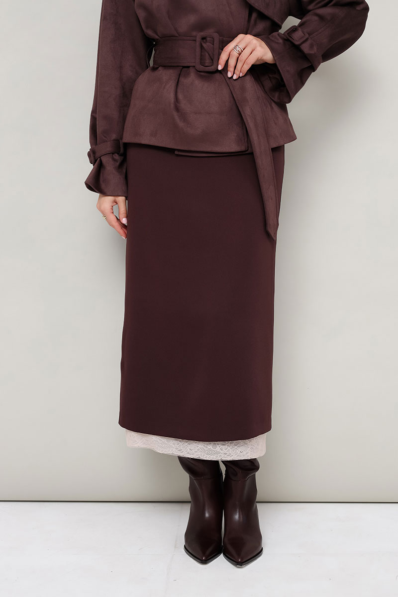 Юбка-карандаш прямого силуэта в длине миди. Верхняя юбка выполнена из костюмно-плательной ткани, пояс на обтачке, застёжка на потайную молнию в среднем шве по спинке. Нижняя юбка на резинке по поясу, низ обработан кружевной отделкой с сеткой. Для удобства движения сзади по юбкам обработаны разрезы.