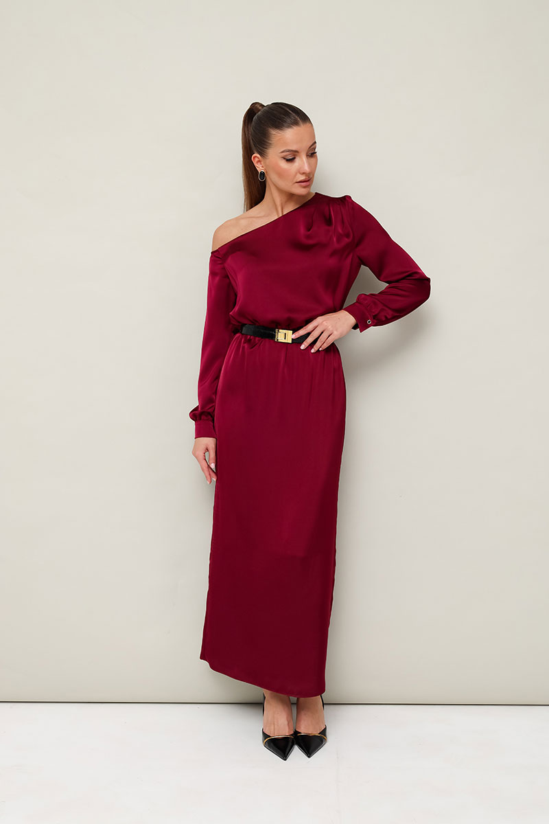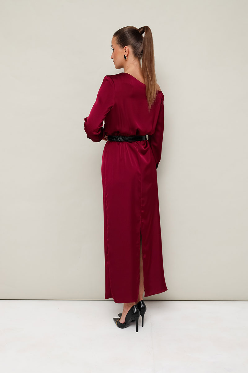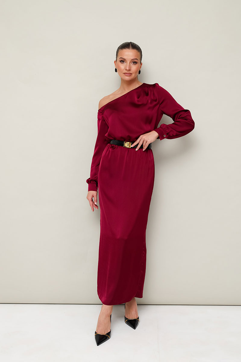 Вечернее платье полуприлегающего силуэта, выполнено из струящейся ткани с благородным матовым блеском. Ассиметричный вырез горловины с открытым плечом. Правый плечевой шов декорирован