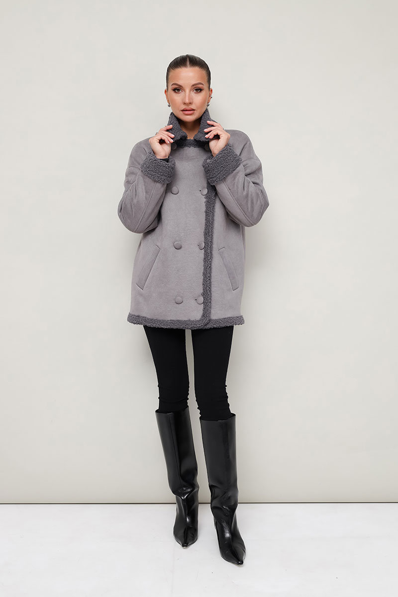 Женская дубленка прямого силуэта, длиной до середины бедра. Воротник и лацканы отложные. Застёжка двубортная на петли и обтяжные пуговицы. Спереди обработаны функциональные карманы с