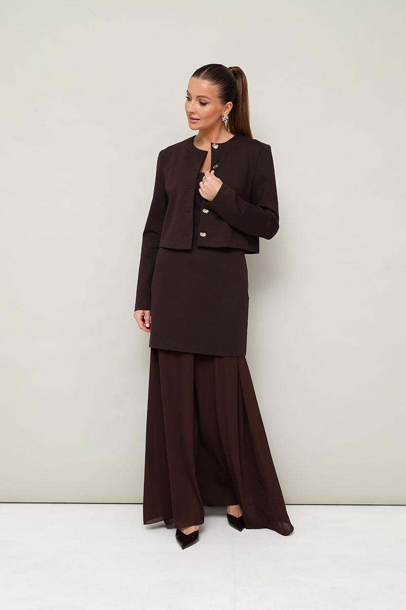 Жакет полуприлегающего силуэта, с центральной застёжкой на петли и акцентные пуговицы. Длинные втачные рукава. Спинка со средним швом.