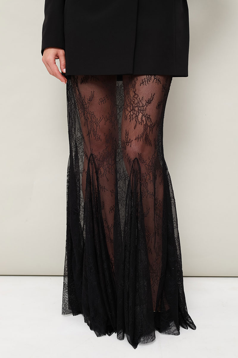 Силуэтное платье-жакет прилегающего кроя, выполнено из качественной костюмной ткани. Воротник пиджачного типа с отложными лацканами. Двубортная застежка на петли и обтяжные пуговицы. Спереди обработаны прорезные карманы в рамку с клапанами и нагрудный прорезной карман с листочкой. Рукава втачные, двухшовные с отлетными шлицами и обтяжными пуговицами. Спинка с рельефами и средним швом. Платье-жакет на подкладке.Силуэтная юбка годе с расклешением от линии колен с втачными клиньями. Юбка выполнена из изысканного кружевного полотна. Пояс обработан резинкой для комфорта и регуляции размера.