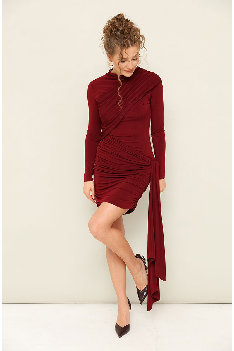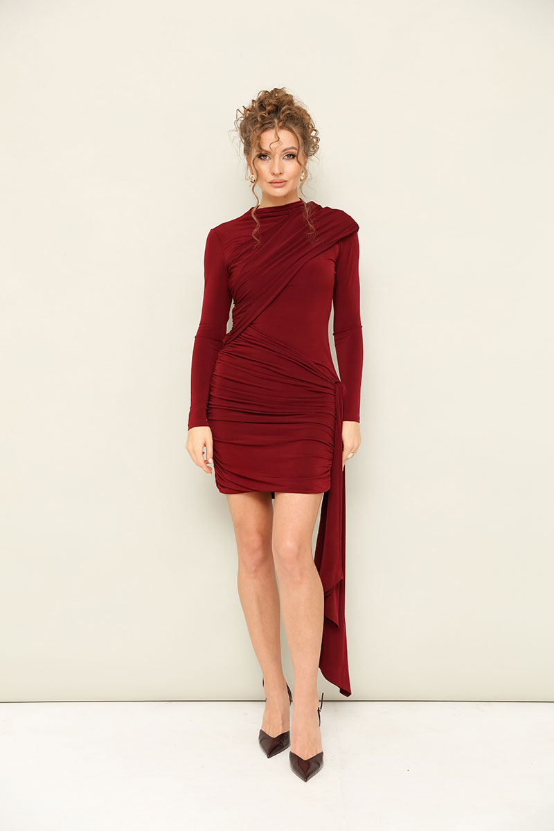 Платье прилегающего силуэта в длине мини, выполнено из эластичной ткани - масло. Горловина с цельнокроеной стойкой. Рукава длинные втачные. Перед и спинка декорированы диагональными