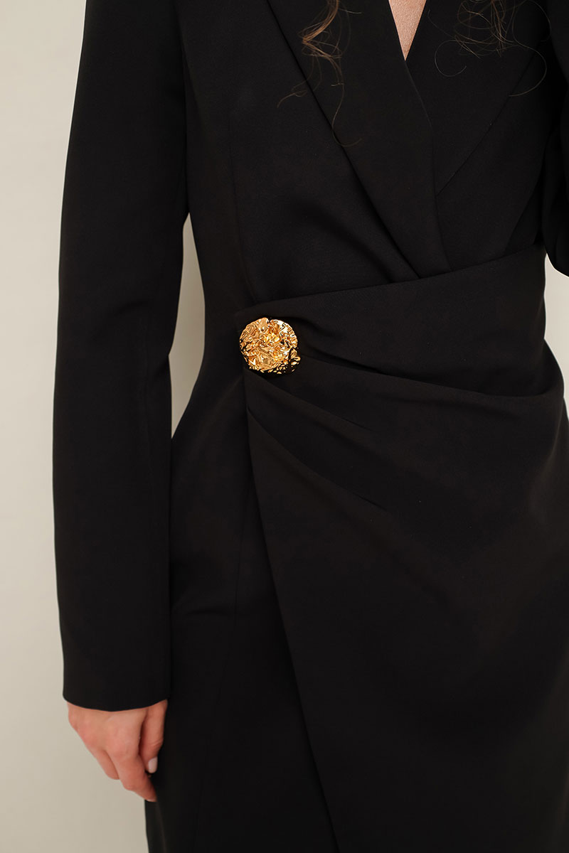 Платье-жакет полуприлегающего кроя, выполнено из костюмной ткани. Воротник пиджачного типа с отложными лацканами. Двубортная застежка на петли и пуговицы. Перед с имитацией запаха с застежкой на акцентную кнопку. Рукава втачные двухшовные. Спинка с рельефами и средним швом. Платье-жакет на подкладке.