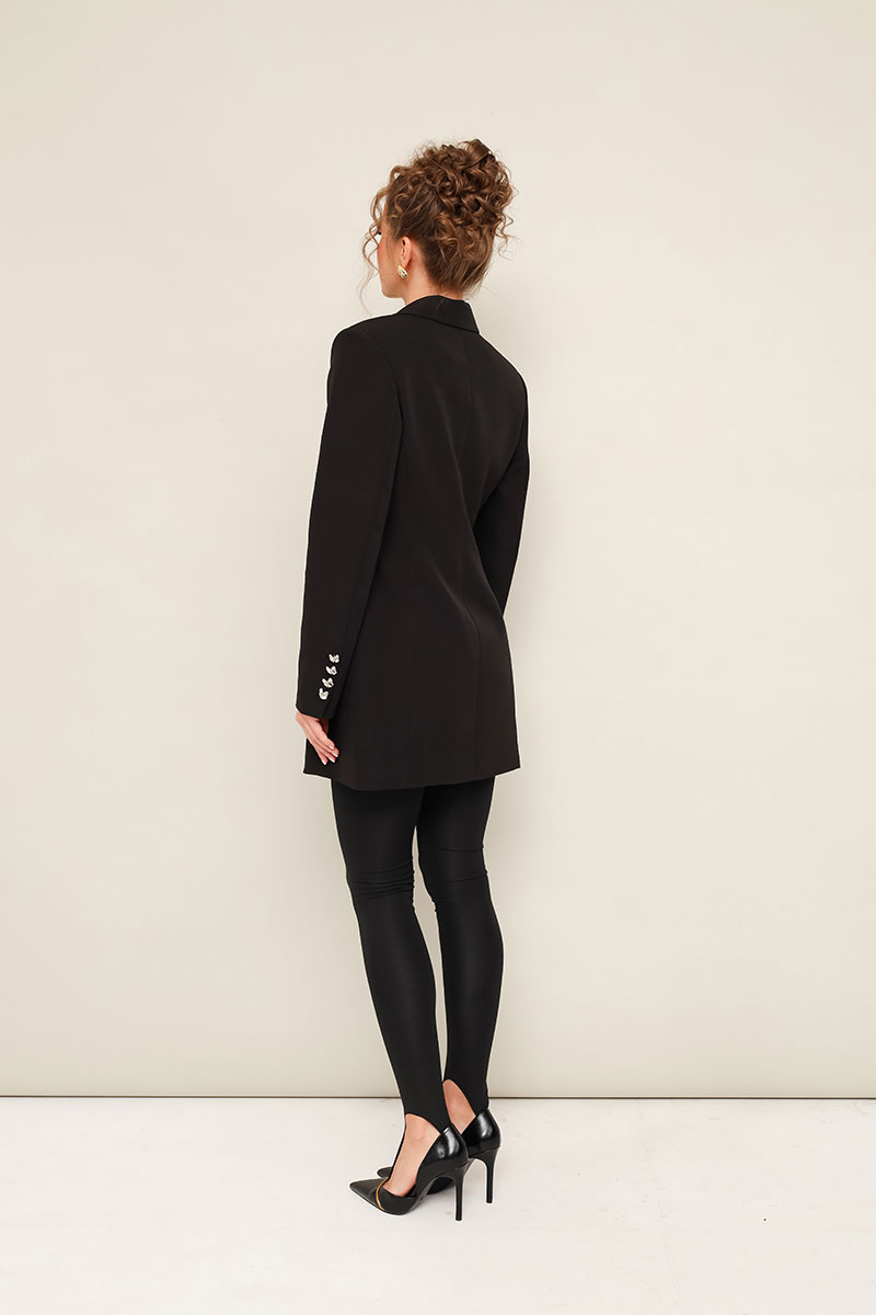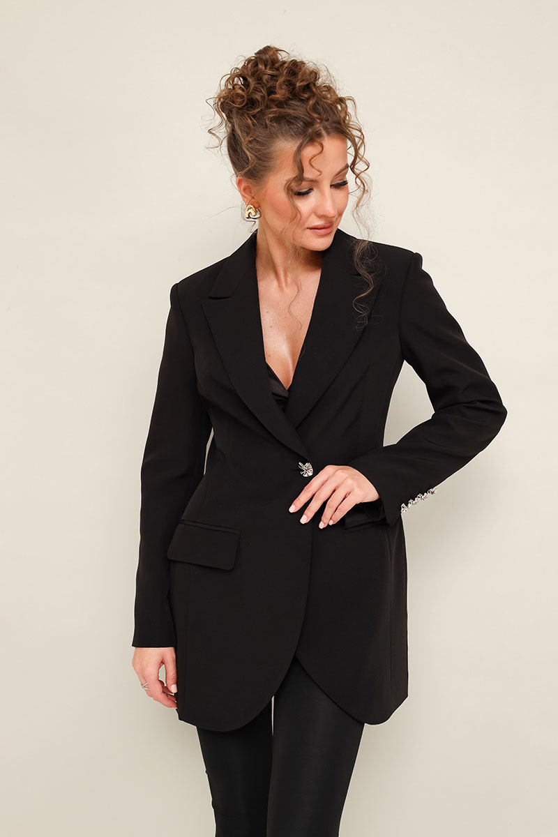 Стильный жакет полуприлегающего силуэта, выполнен из костюмной ткани. Смещенная застежка на петлю и пуговицу. Воротник пиджачного типа с отложными лацканами, край борта скругленный по низу жакета. Спереди обработаны прорезные карманы в рамку с клапанами. Рукава втачные, двухшовные со шлицами с застежкой на петли и пуговицы. Спинка с рельефами и средним швом. Жакет на подкладке.